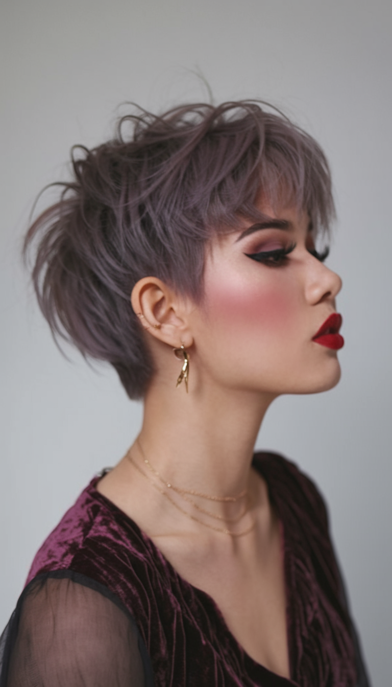 This textured pixie cut is elevated with soft, smoky lavender highlights, adding depth and creativity to the style. The tousled layers create volume and movement, perfect for women wanting a playful yet elegant look. This trendy haircut is ideal for making a subtle but unique statement.