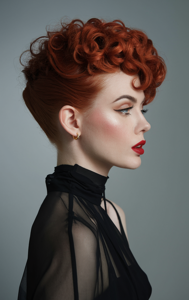 This curly updo features bold, voluminous curls styled with precision for a dramatic effect. The fiery red hue enhances the hair’s texture, adding vibrancy and a modern touch. This hairstyle is perfect for women who want a standout look with a playful yet polished vibe.