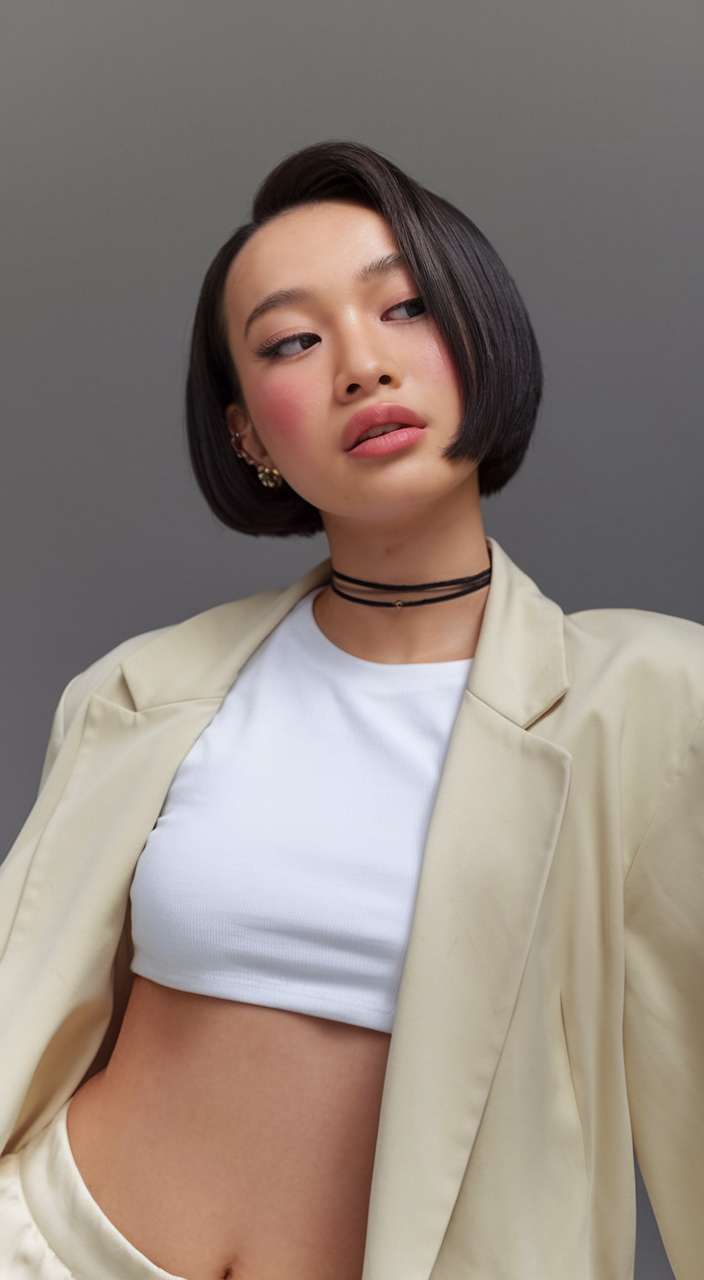 This sleek blunt bob is styled with precision for a modern, polished look. The cut emphasizes a clean, straight line, ideal for women with an oval face or those who appreciate minimalistic elegance. The natural brown hair color complements the smooth texture, making it one of the best spring haircuts for short hair. It’s perfect for those who want an easy yet sophisticated style.