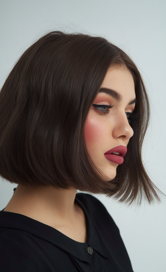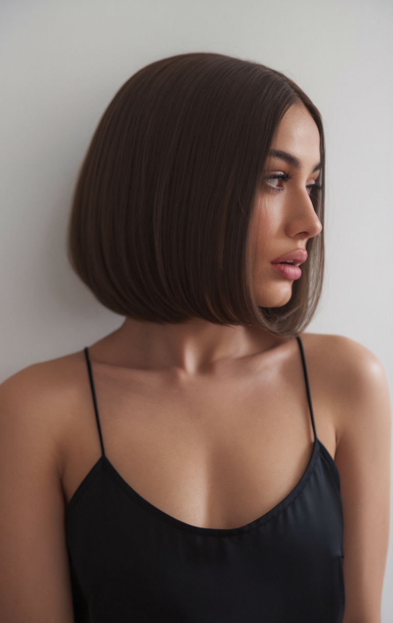 This chin-length bob boasts a sleek and polished finish with a subtle side-swept bang for added sophistication. The rich brunette tone enhances the smooth texture, making it a timeless choice for women with oval or round faces. It’s an easy-to-maintain style that blends simplicity with elegance.