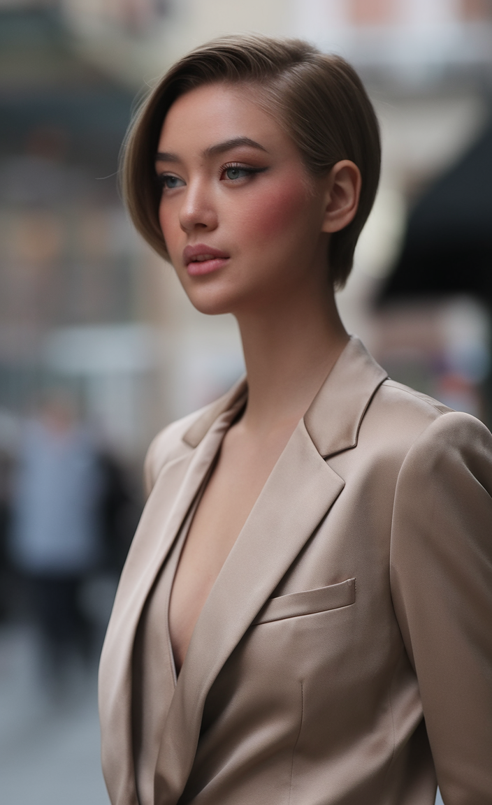 This ultra-short pixie cut features sleek, neatly trimmed sides with a hint of soft waves on top for texture. The warm chestnut brown color adds richness and dimension, making it perfect for women seeking a minimal yet stylish look. This haircut highlights facial features beautifully and is one of the best low-maintenance spring haircuts for short hair.