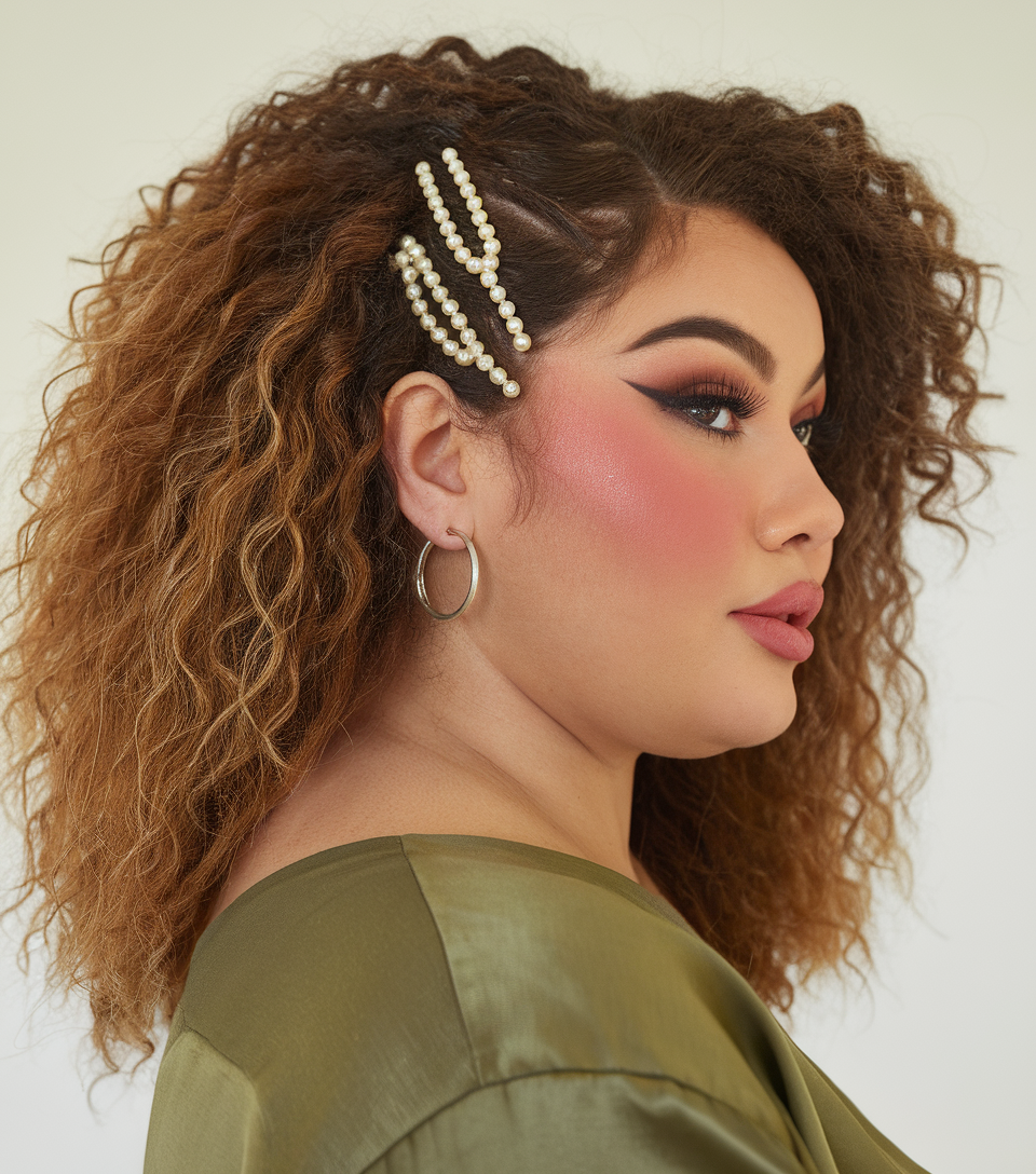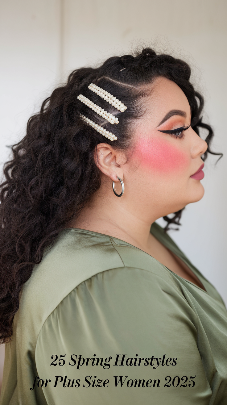Natural, voluminous curly hair is styled with pearl-studded clips for added flair and texture. This hairstyle celebrates natural beauty while offering a playful yet chic spring look. Ideal for medium or long hair, it’s a versatile choice for both casual and formal settings.
