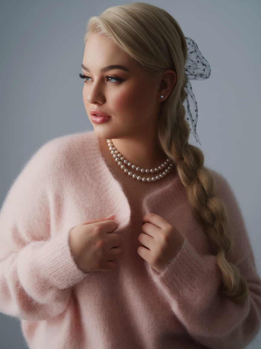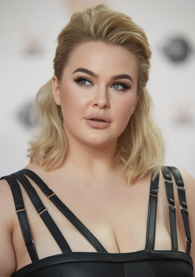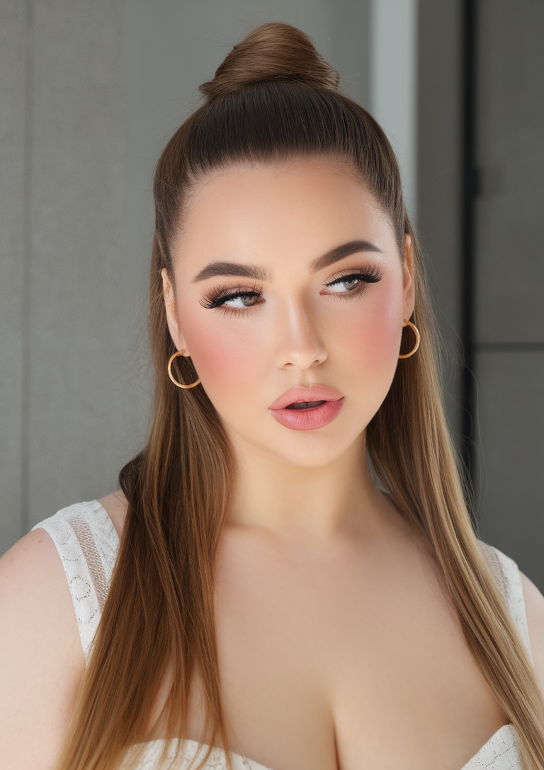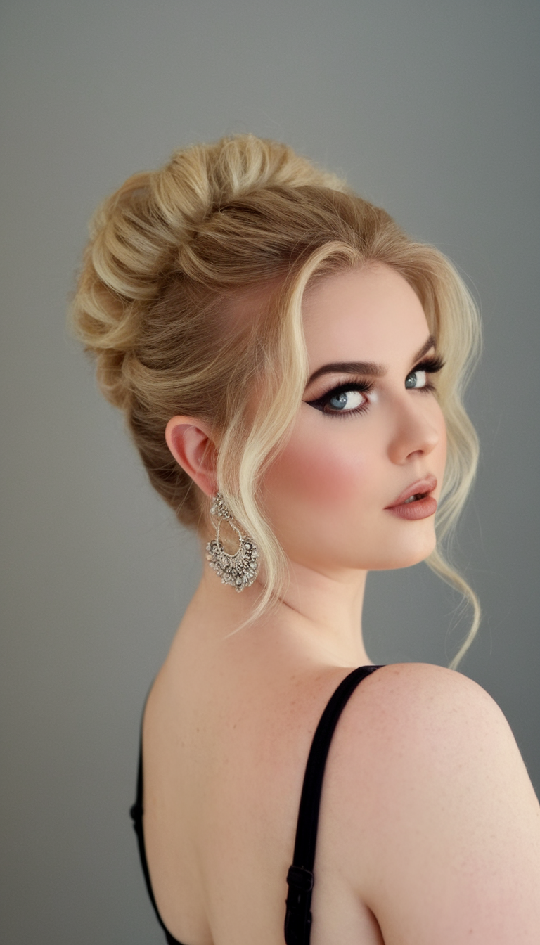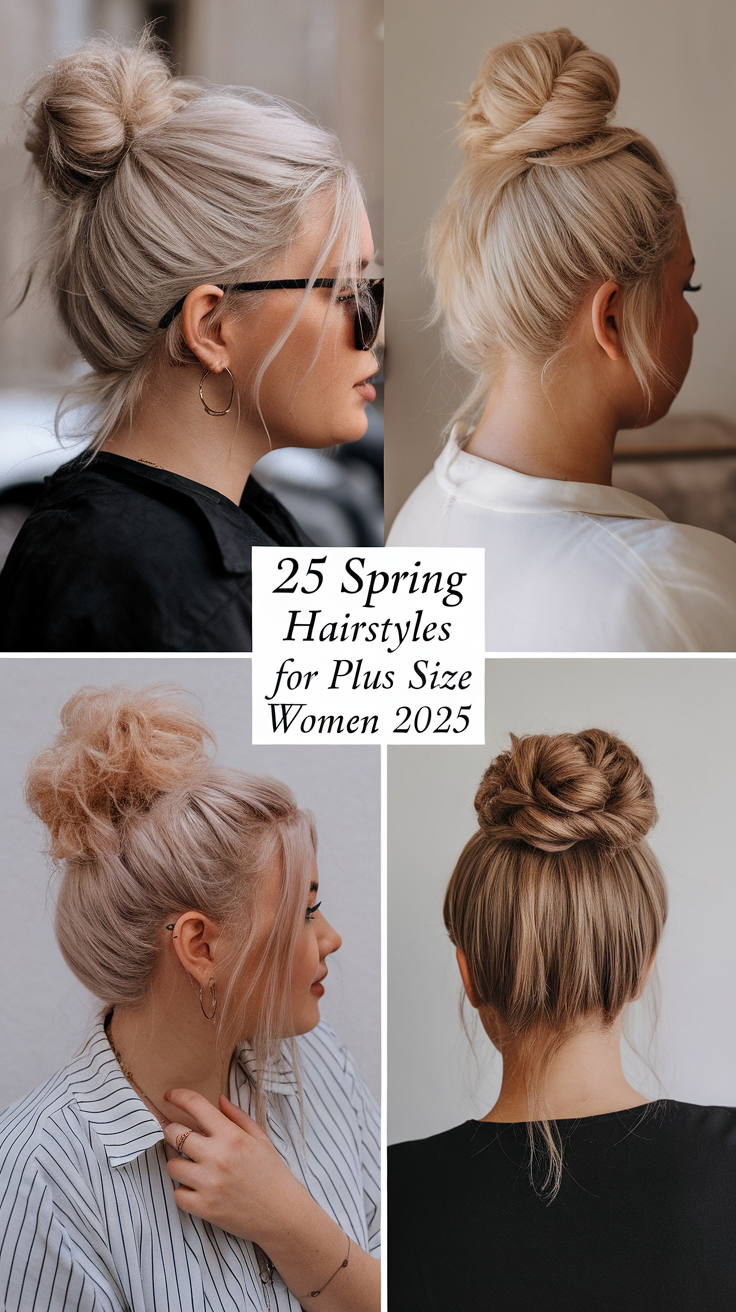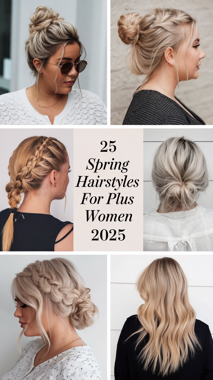 This half-up hairstyle features voluminous blonde waves swept back to create height and a glamorous effect. The style flatters medium-length hair, adding movement and dimension perfect for spring hairstyles for plus-size women 2025. It’s an ideal choice for casual and formal occasions alike.