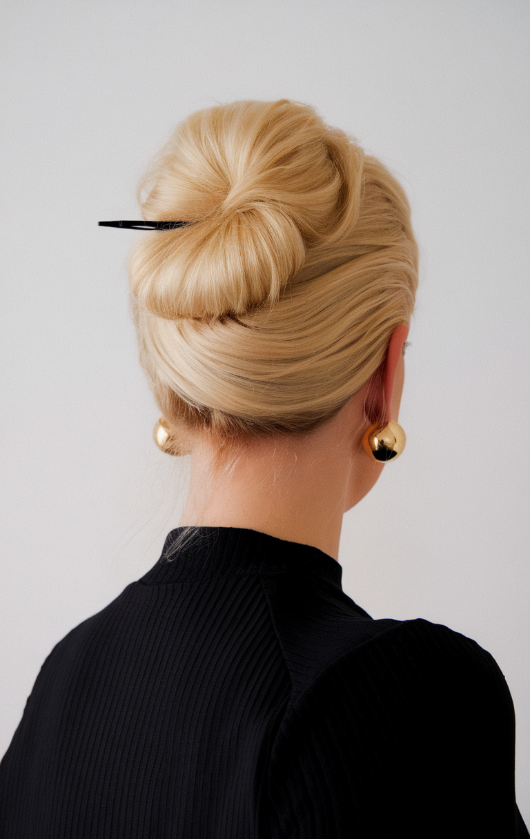 This timeless French twist features smooth, blonde locks carefully pinned for a polished, structured look. The style adds height and sophistication, making it ideal for formal wedding or bridal events. It complements spring hairstyles for plus-size women 2025, offering an elegant option for thin hair.