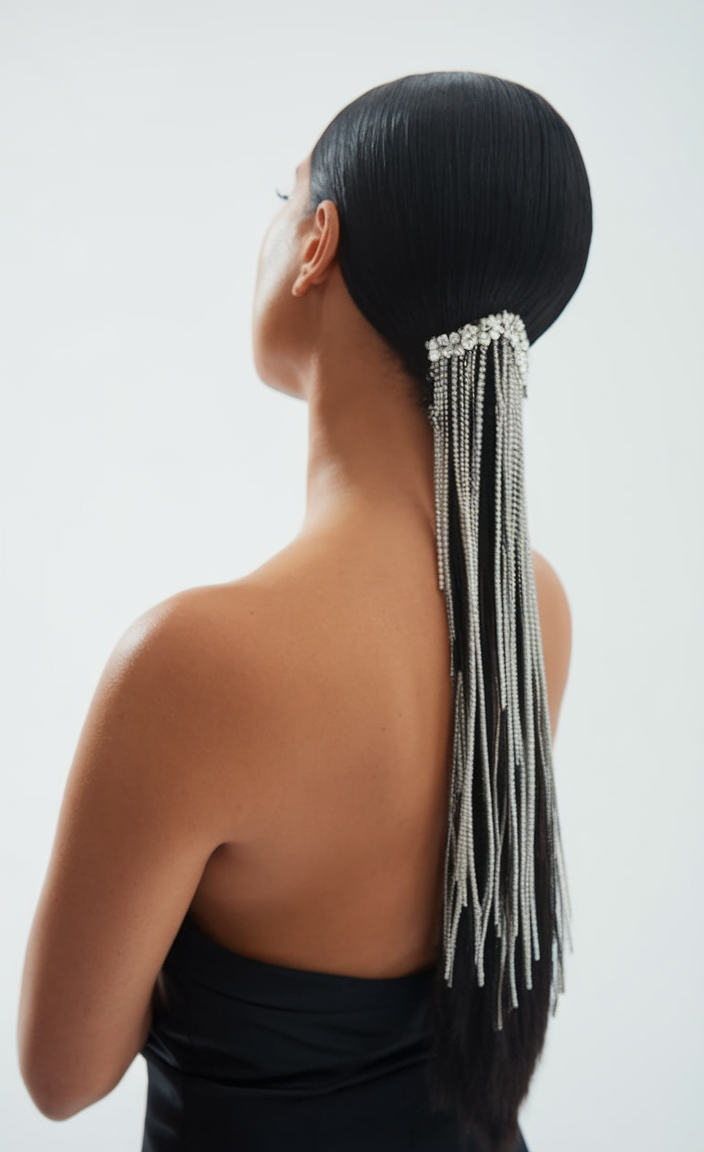 A sleek, straight ponytail is adorned with cascading crystal chains, adding drama and elegance. This hairstyle is perfect for mid-length or long hair, ideal for evening events or glamorous spring occasions. The smooth finish enhances the shine, creating a modern, striking look.
