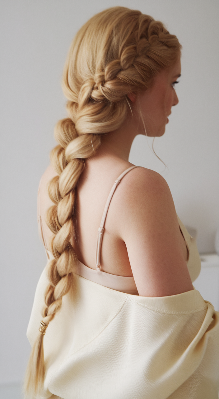 This intricate side braid combines thick, golden blonde sections with loose tendrils framing the face. It’s a romantic choice for casual spring outings or bridal looks, especially for long or mid-length hair. The relaxed finish offers texture and charm, making it an easy yet stunning hairstyle.