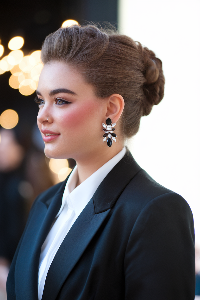 This elegant twisted bun combines volume at the crown with a structured, braided texture at the back. The rich brown tone enhances the style, making it perfect for formal spring hairstyles for plus-size women 2025. It’s a timeless option for weddings or women in their 40s, highlighting sophistication.