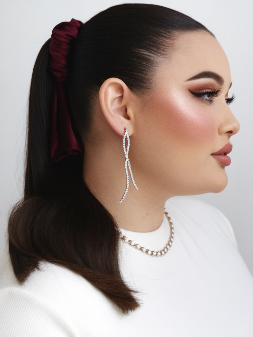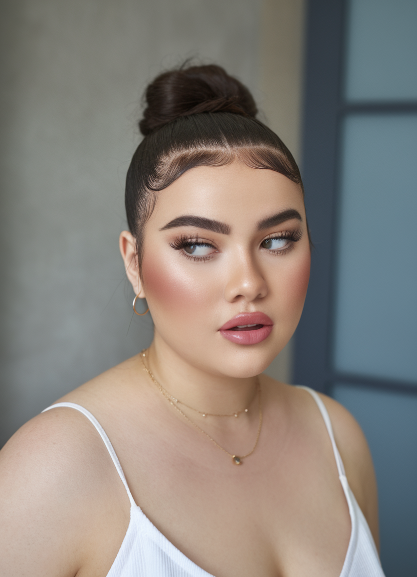 This sleek low bun is styled with a vibrant yellow printed scarf, adding elegance and flair. The hairstyle highlights smooth, straight hair pulled back tightly, making it ideal for spring hairstyles for plus-size women 2025. It is a versatile choice for wedding or bridal events while being easy to recreate with minimal effort.
