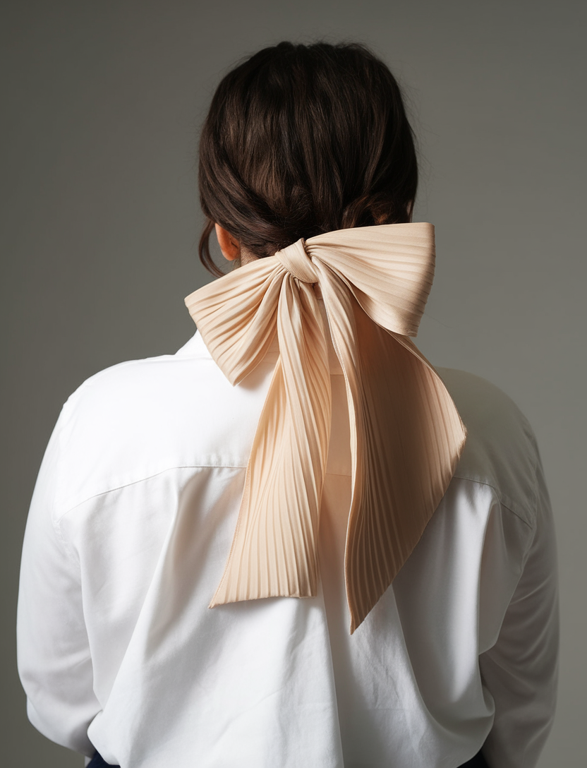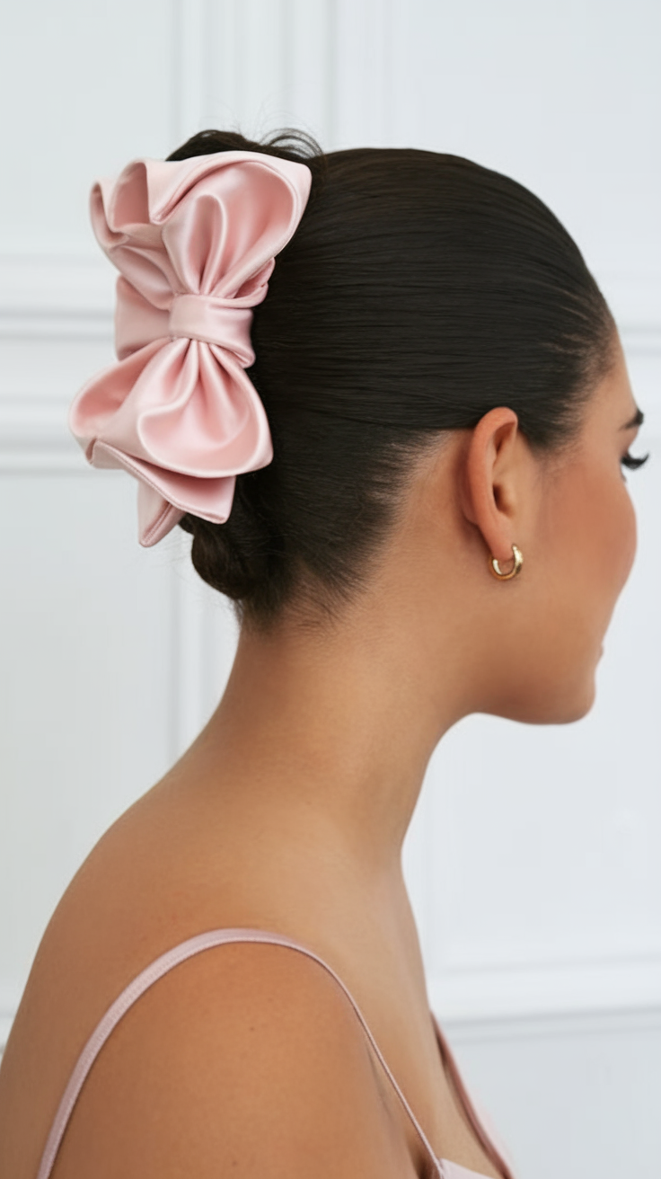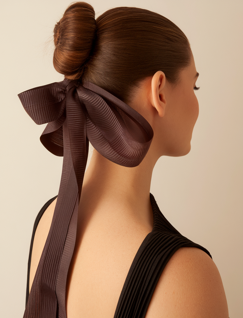This polished bun is secured at the nape and accented with a bold, textured bow in deep brown. The sleek, glossy finish of the hair enhances the elegance, ideal for weddings or formal occasions. It’s a stunning choice for thin hair, adding structure and flair effortlessly.