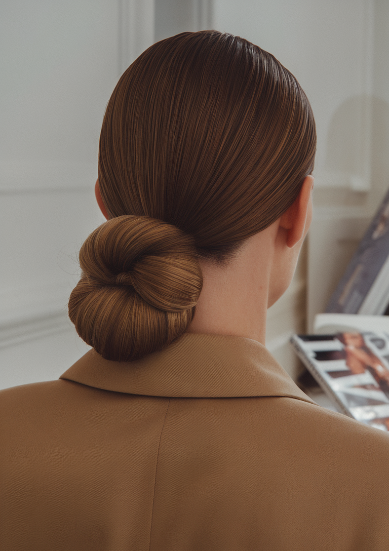 A twisted low bun showcases a rich brown tone with a smooth, glossy finish, making it sleek and sophisticated. The structured style flatters mid-length hair and is perfect for professional or formal settings. Its neat appearance makes it an easy yet chic spring option.