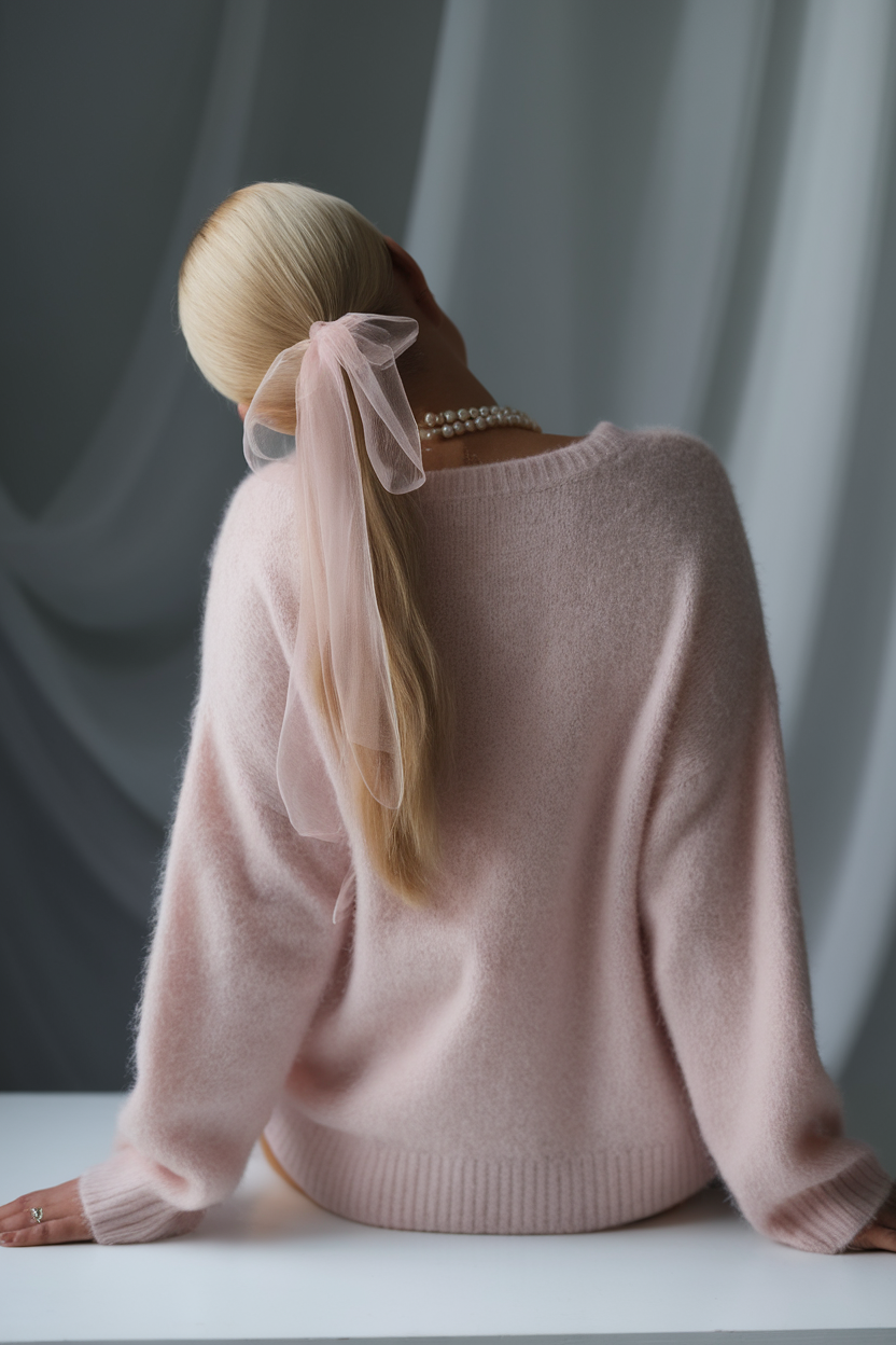 A sleek low ponytail is enhanced with a soft pink sheer ribbon, adding elegance and charm. The straight, glossy blonde strands keep the look neat, perfect for thin hair or mid-length styles. This minimalist yet stylish option is great for daytime events or a polished everyday look.