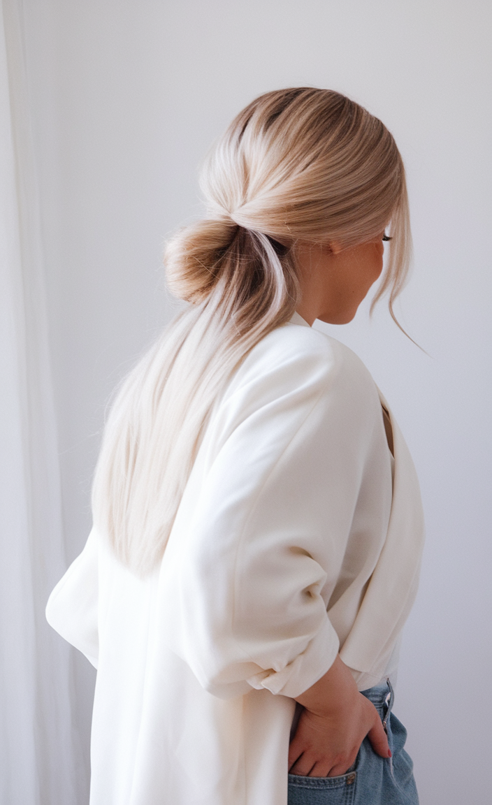 A soft, low bun creates a relaxed yet sophisticated look, paired with straight, light blonde hair. The style incorporates face-framing strands for added softness, making it ideal for casual or formal occasions. Its smooth texture highlights the natural gradient of warm blonde tones.