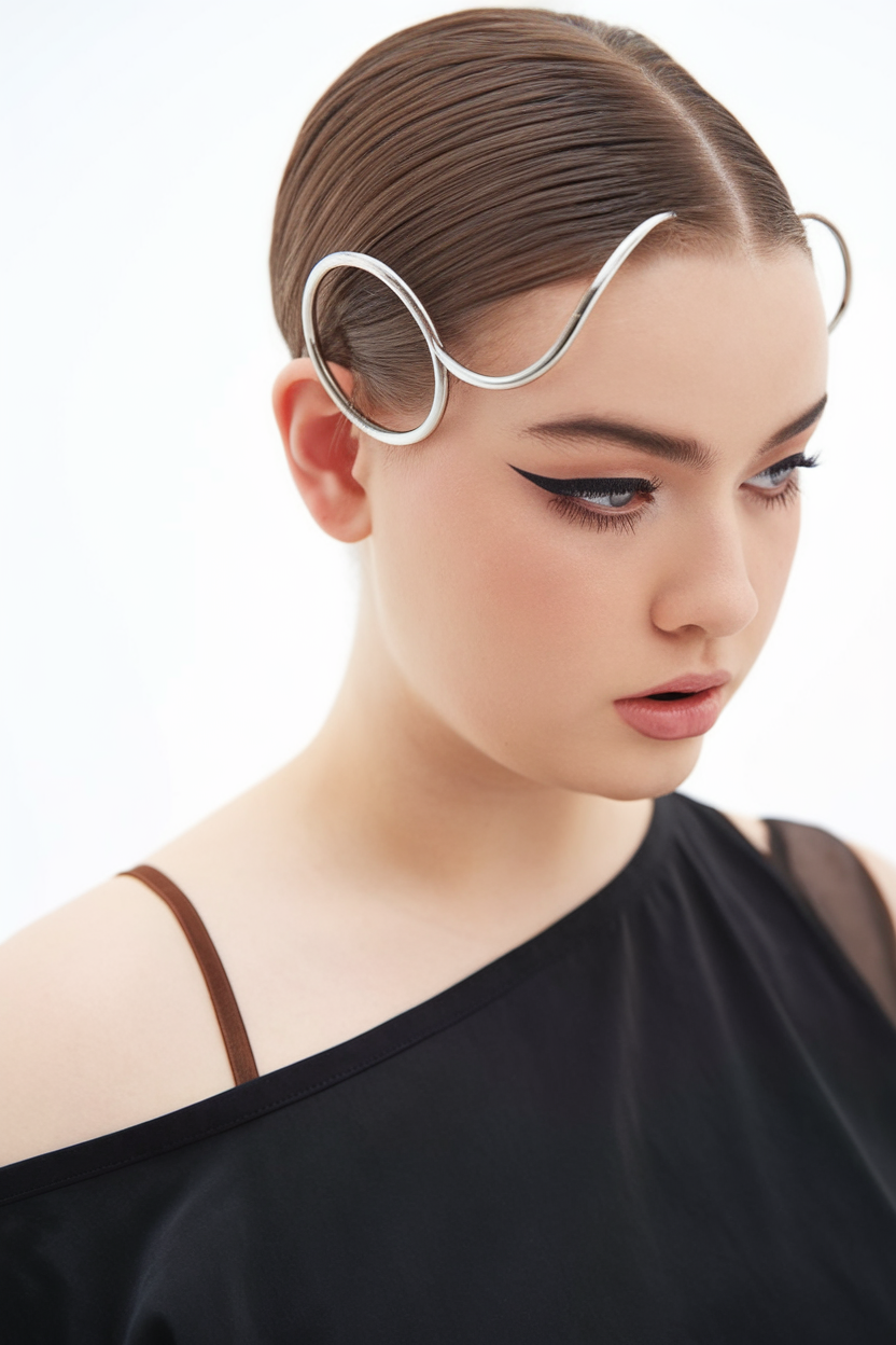 This sleek, sculpted updo features deep brown hair with a glossy finish. The hair is styled into a modern, geometric design with a metallic silver hairpiece adding a futuristic touch. The precise middle part enhances the sharp and elegant appearance of this look.