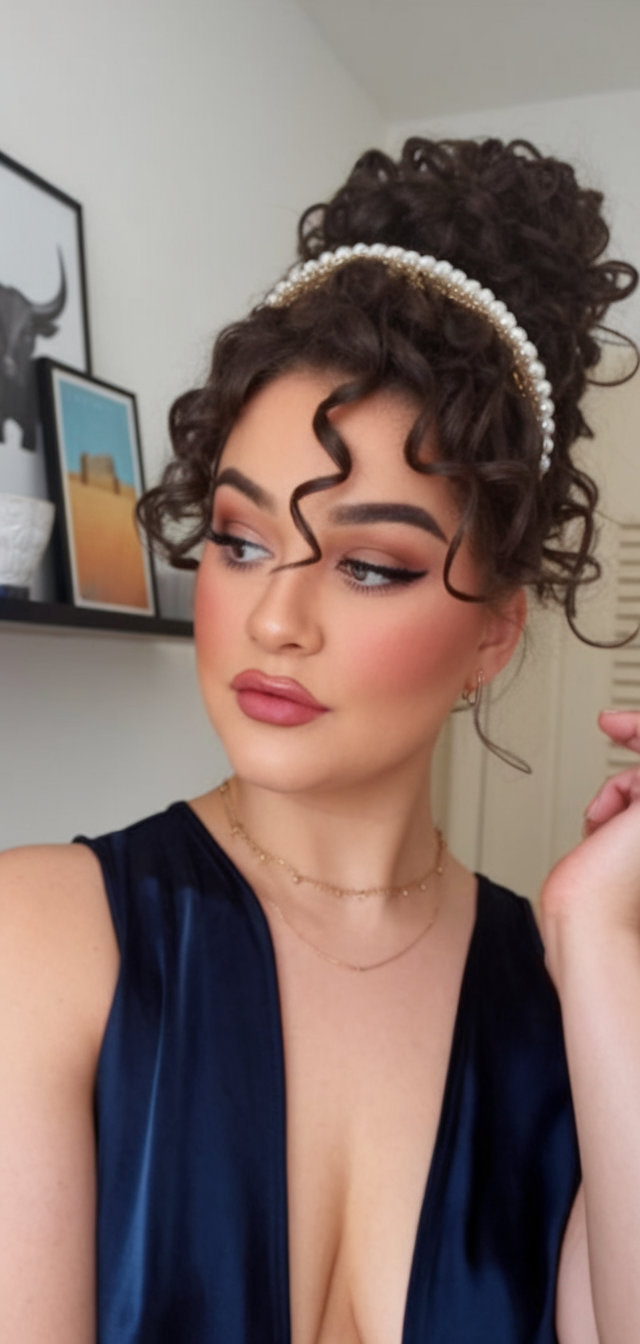 Rich, dark brown curls are styled into a high, voluminous updo for a playful and glamorous vibe. Loose ringlets cascade around the face, softening the look, while a pearl-studded headband adds a classic, refined detail. The texture creates a bold statement, perfect for special occasions.
