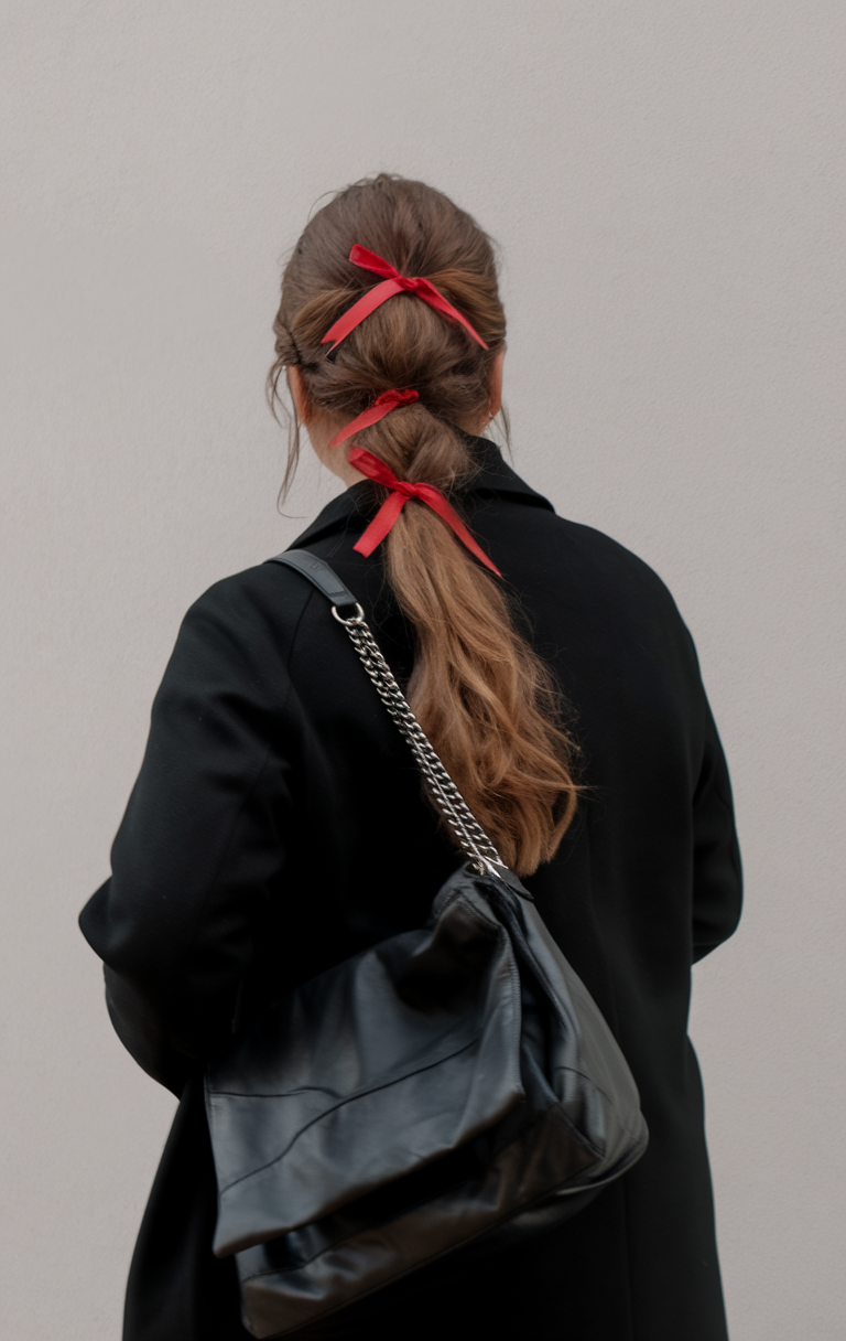 This unique low ponytail features loosely secured sections tied with bold red ribbons. The natural wavy texture adds a casual yet chic touch, perfect for mid-length or long hair. It’s an easy option for spring outings, combining playfulness with practicality.