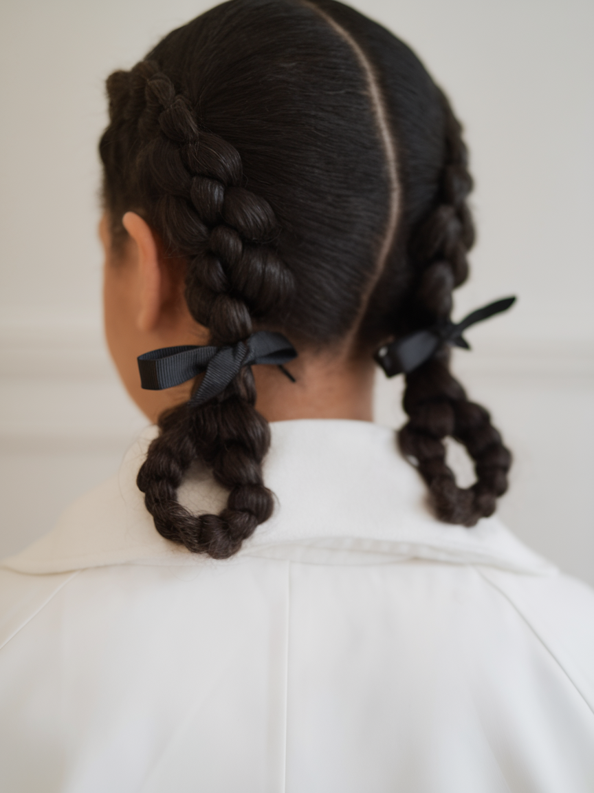 Two symmetrical braids styled into curly pigtails are secured with black bows for a polished finish. This structured look suits thin hair, offering a neat and elegant appearance for formal or casual occasions. Perfect for spring hairstyles for plus-size women 2025, it’s a youthful yet versatile choice.
