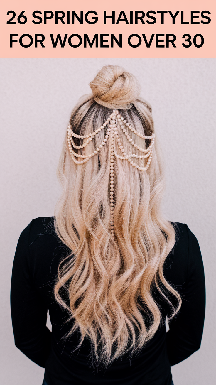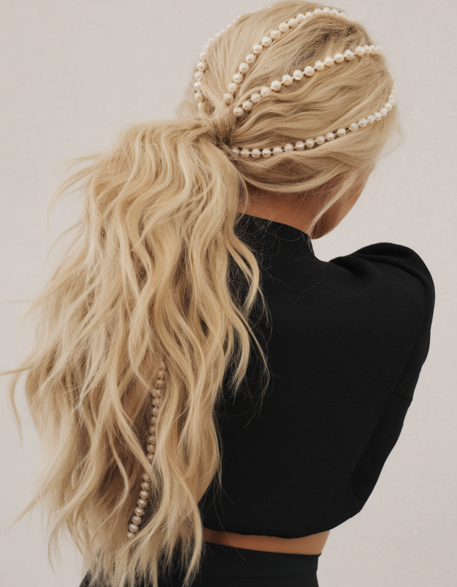 This hairstyle combines loose, beachy waves with pearl accents elegantly woven through the crown and ponytail. The long blonde hair provides a soft, romantic look, perfect for spring 2025 trends. This easy and modern style is great for round faces and adds a sophisticated touch to any outfit.