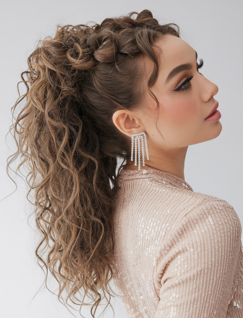 This modern curly high ponytail features voluminous texture with twisted details at the crown for added interest. The warm brunette tone enhances the natural curls, making it a trendy spring hairstyle for women over 30. Perfect for both formal and everyday wear, this style is ideal for oval and round faces.