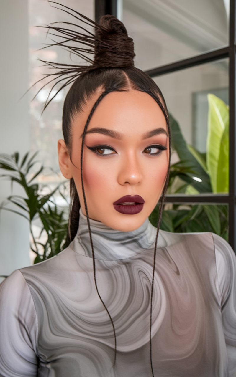 This unique braided topknot pairs sleek, tightly woven braids with edgy face-framing strands. The dark brown hair color emphasizes the intricate structure, making it a trendy and bold hairstyle for women seeking a standout look. Ideal for formal events, this style is a striking choice for the spring season.