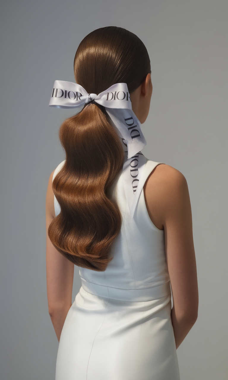This style features long, glossy waves tied with a statement ribbon for a chic and refined finish. The smooth caramel tones enhance shine, making this a trendy medium-length hairstyle for spring. It’s perfect for adding a luxurious touch to everyday wear or special events.