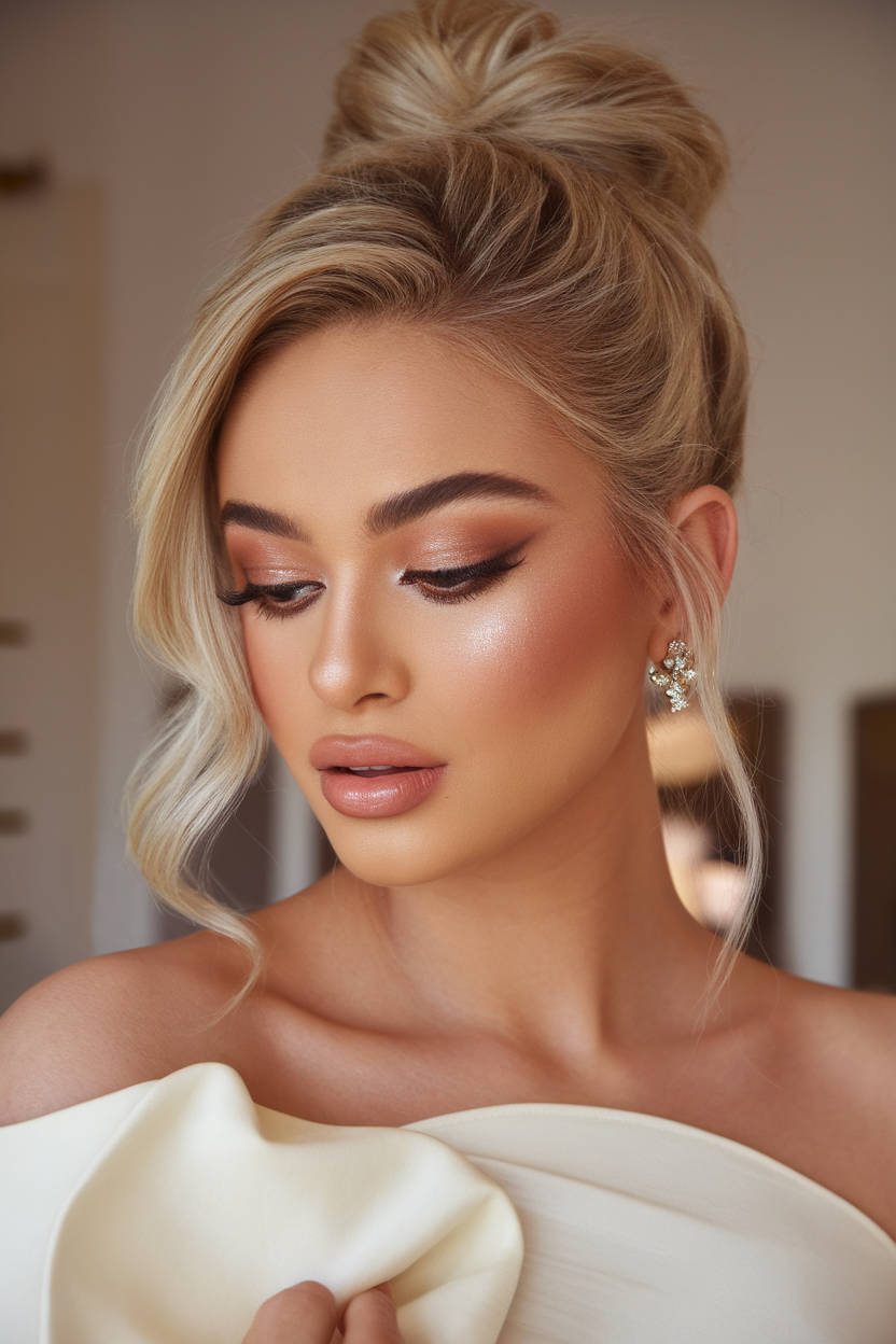 This sleek high bun showcases platinum blonde hair with soft face-framing highlights for added dimension. The polished and refined style is ideal for formal occasions, offering a modern and sophisticated look. Perfect for spring 2025 trends, it flatters oval and round face shapes alike.
