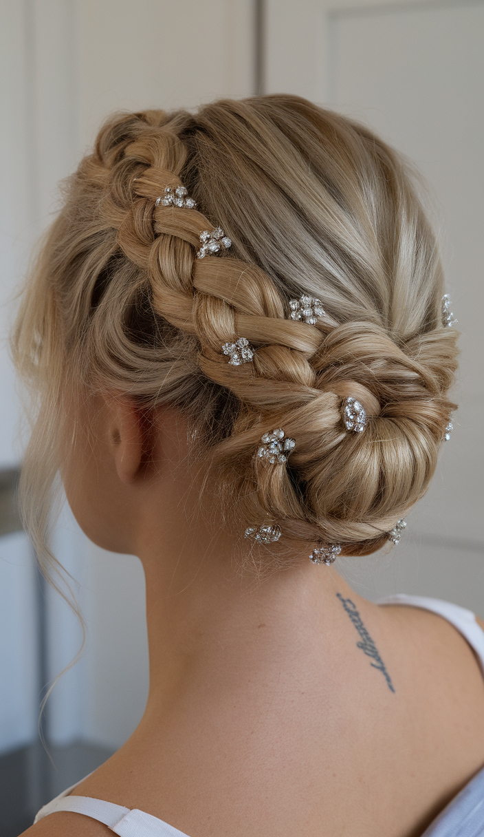 This hairstyle features an intricate braided crown adorned with sparkling crystal embellishments. The soft blonde hair is styled neatly, creating a regal and elegant look for spring 2025. Perfect for formal events, this modern hairstyle is both sophisticated and timeless.