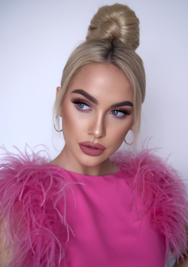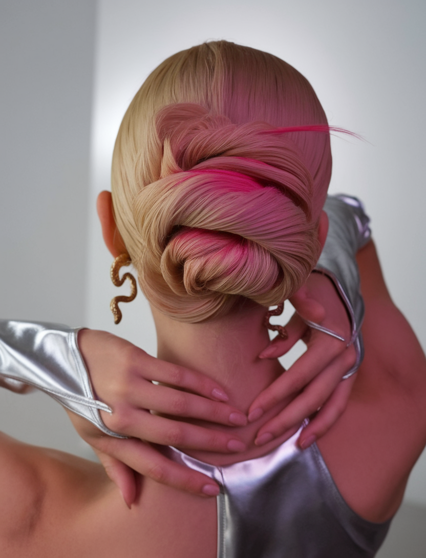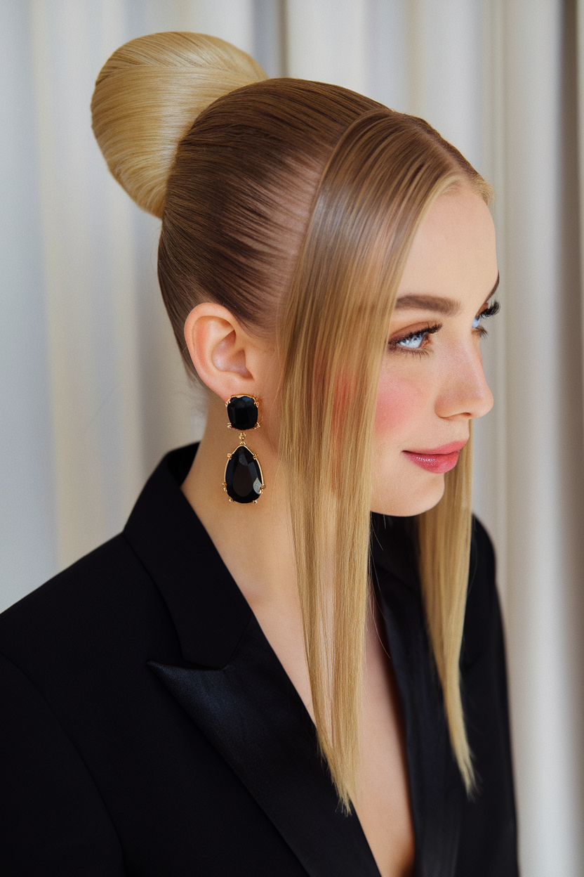 This sleek high bun features straight, platinum-blonde hair with sharp face-framing strands for a striking contrast. The smooth finish makes it a perfect choice for modern and formal occasions. This hairstyle flatters oval and round faces, combining elegance with simplicity.