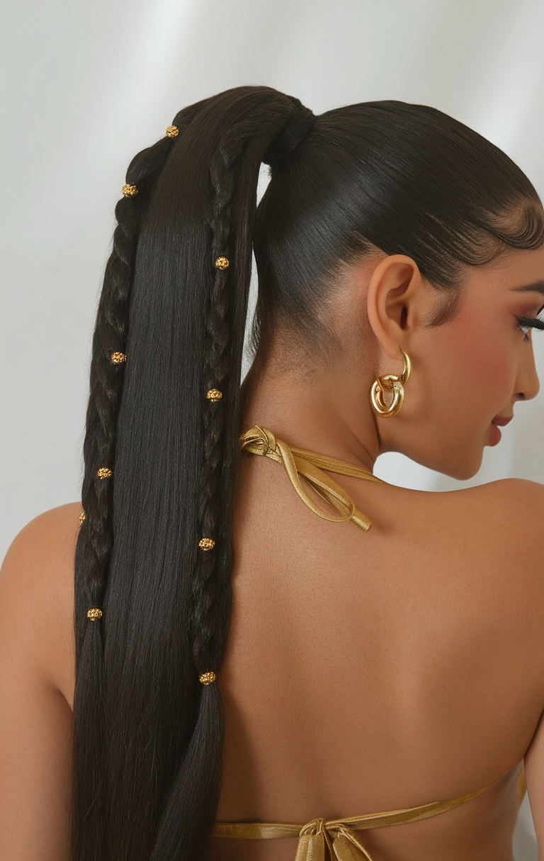 This sleek, high ponytail features long, straight black hair enhanced with braided sections and gold embellishments. The polished finish makes it perfect for a modern and trendy spring look. It’s a versatile hairstyle that works well for both formal and casual occasions.