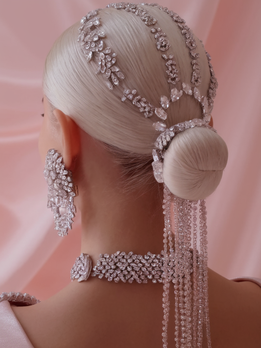 This low bun is styled with platinum-blonde hair, complemented by intricate crystal embellishments that cascade elegantly. The sleek texture and precise finish give this hairstyle a luxurious and timeless appeal. Ideal for formal events, it’s a standout choice for spring 2025.