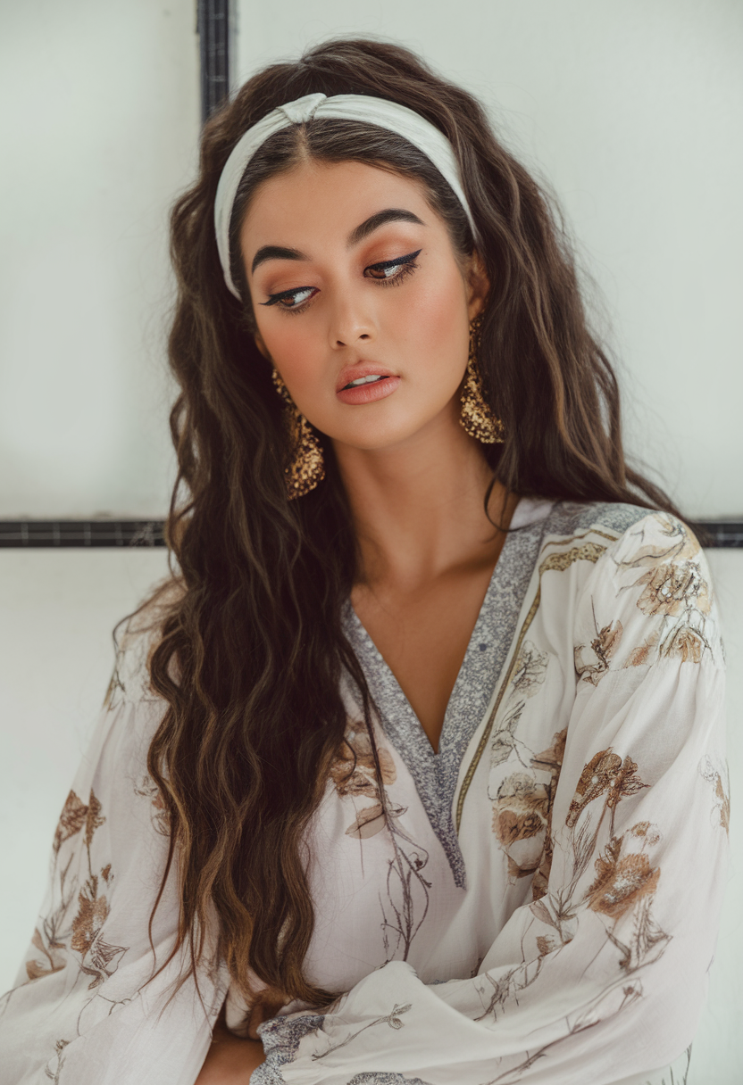 This hairstyle features voluminous, natural waves paired with a soft white knotted headband for a bohemian-inspired look. The dark brown hair is styled effortlessly, making it perfect for casual and everyday occasions. It’s a trendy spring hairstyle for women over 30, adding charm and ease to any outfit.