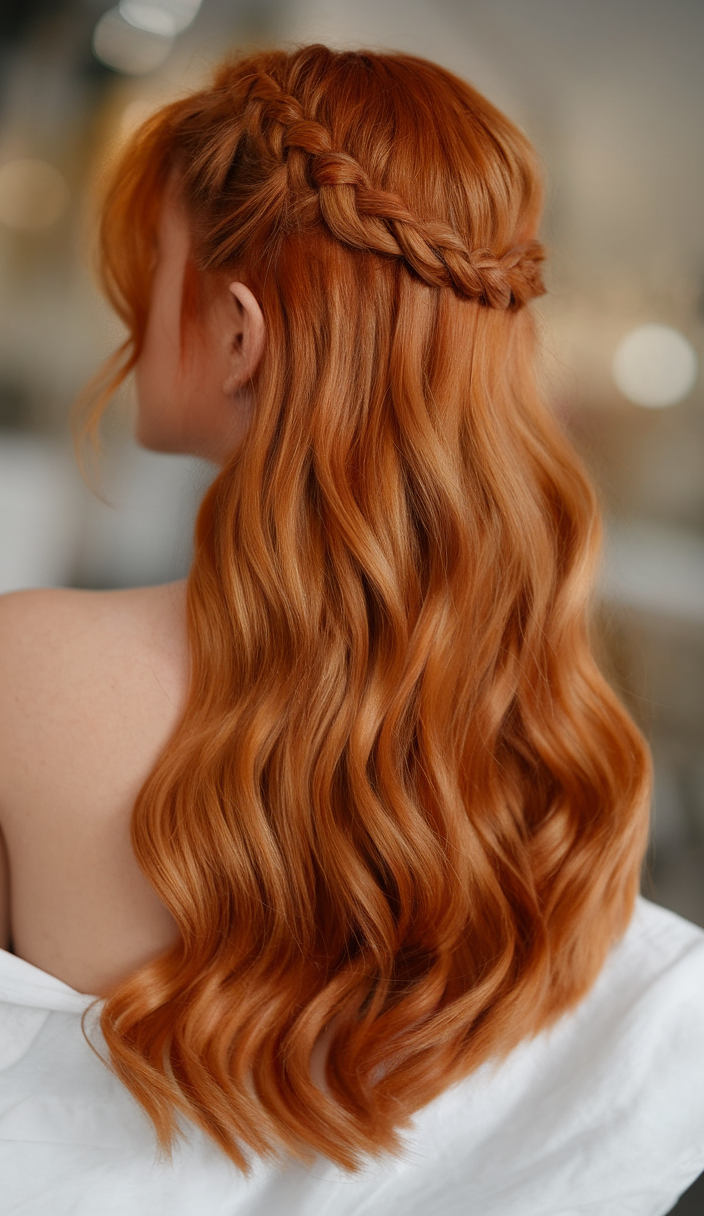 This modern hairstyle features a braided crown paired with soft, cascading waves, creating a romantic look for medium-length hair. The warm copper tones add vibrancy, making it a great choice for spring. It’s an easy yet trendy style, perfect for women over 30 seeking a fresh, everyday option.