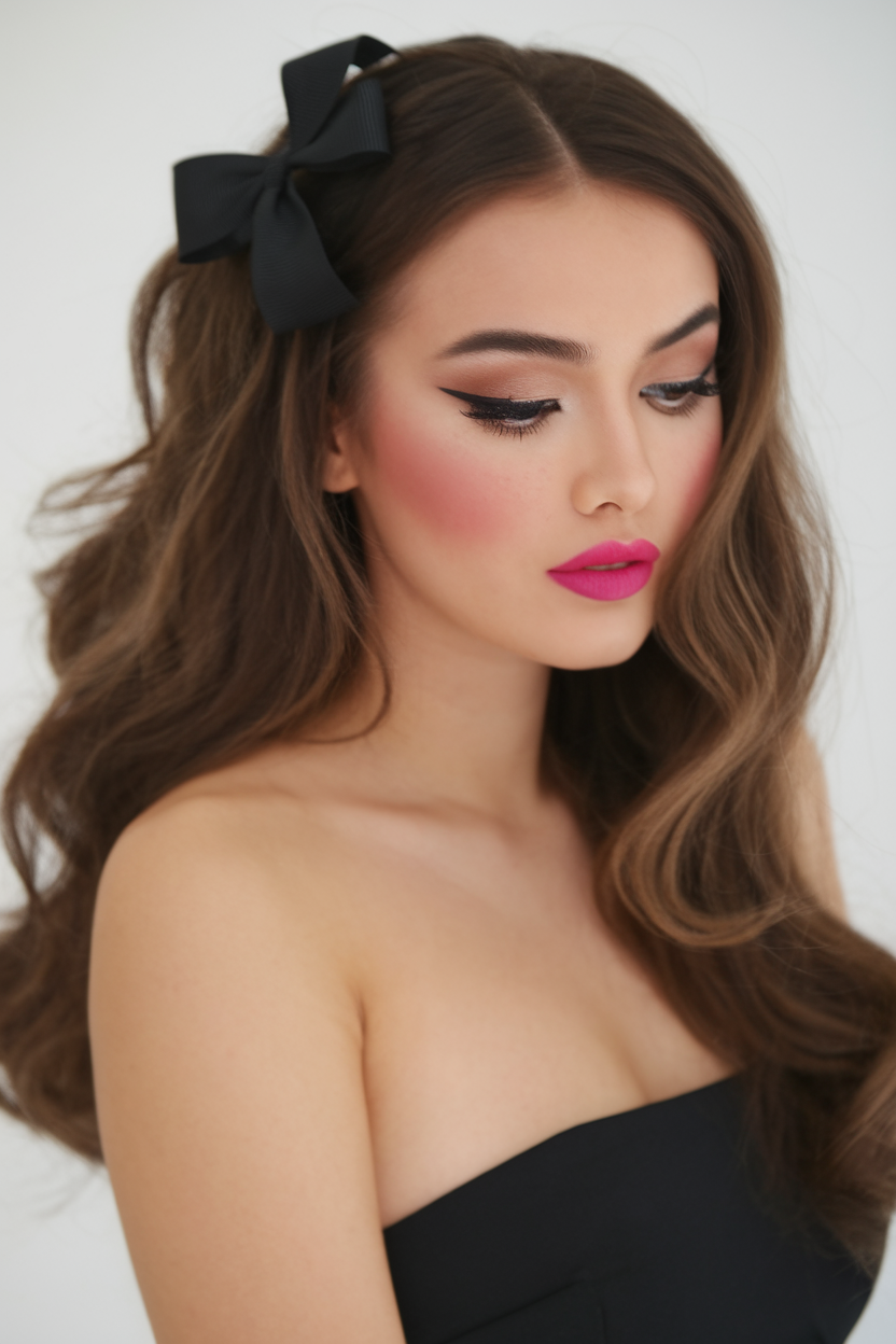 This hairstyle showcases long, flowing waves with a sleek finish, accented by a chic black bow. The rich brunette tones enhance the natural shine, making this one of the best spring hairstyles for women over 30. It’s perfect for round faces and ideal for an easy, everyday look.