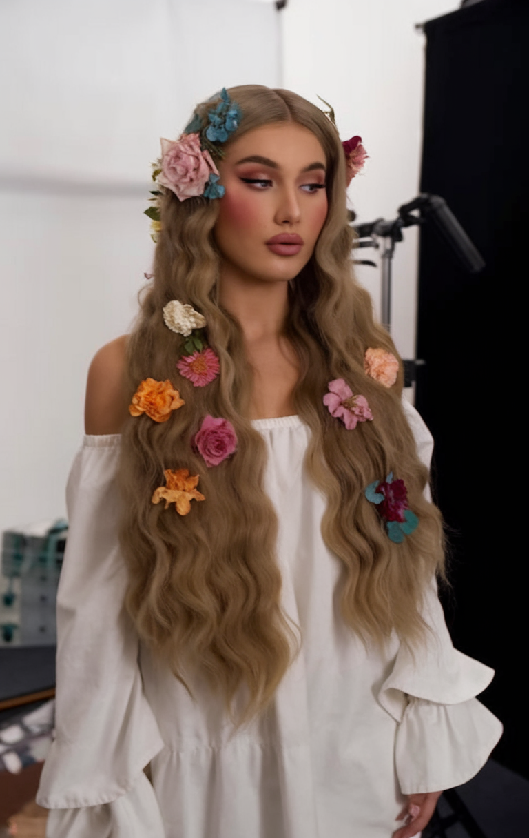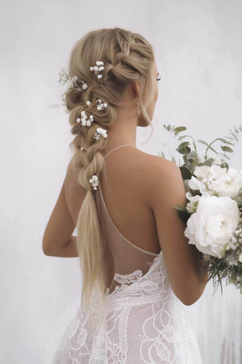 This intricate braided fishtail combines long blonde hair with delicate baby’s breath flowers tucked into the braid. The style is perfect for special occasions, offering a balance of sophistication and natural beauty. It’s a modern spring hairstyle that works beautifully for round and oval faces.