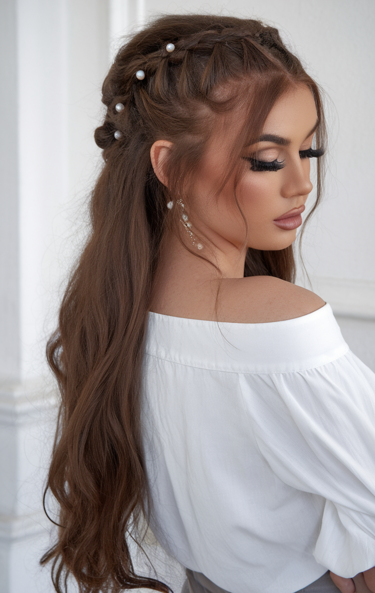 This twisted half-up hairstyle blends smooth, cascading waves with pearl accents for an elegant touch. The rich brunette hair color adds depth and shine, making this a great option for medium-length hair. It’s an easy yet fashionable look that’s perfect for both everyday wear and formal occasions.