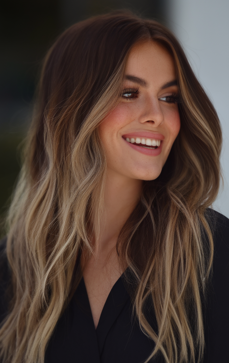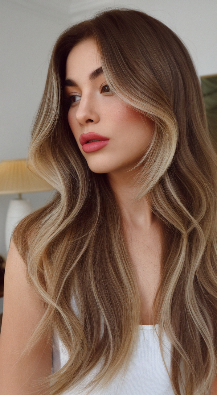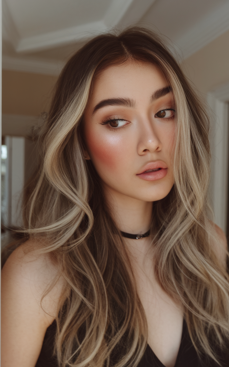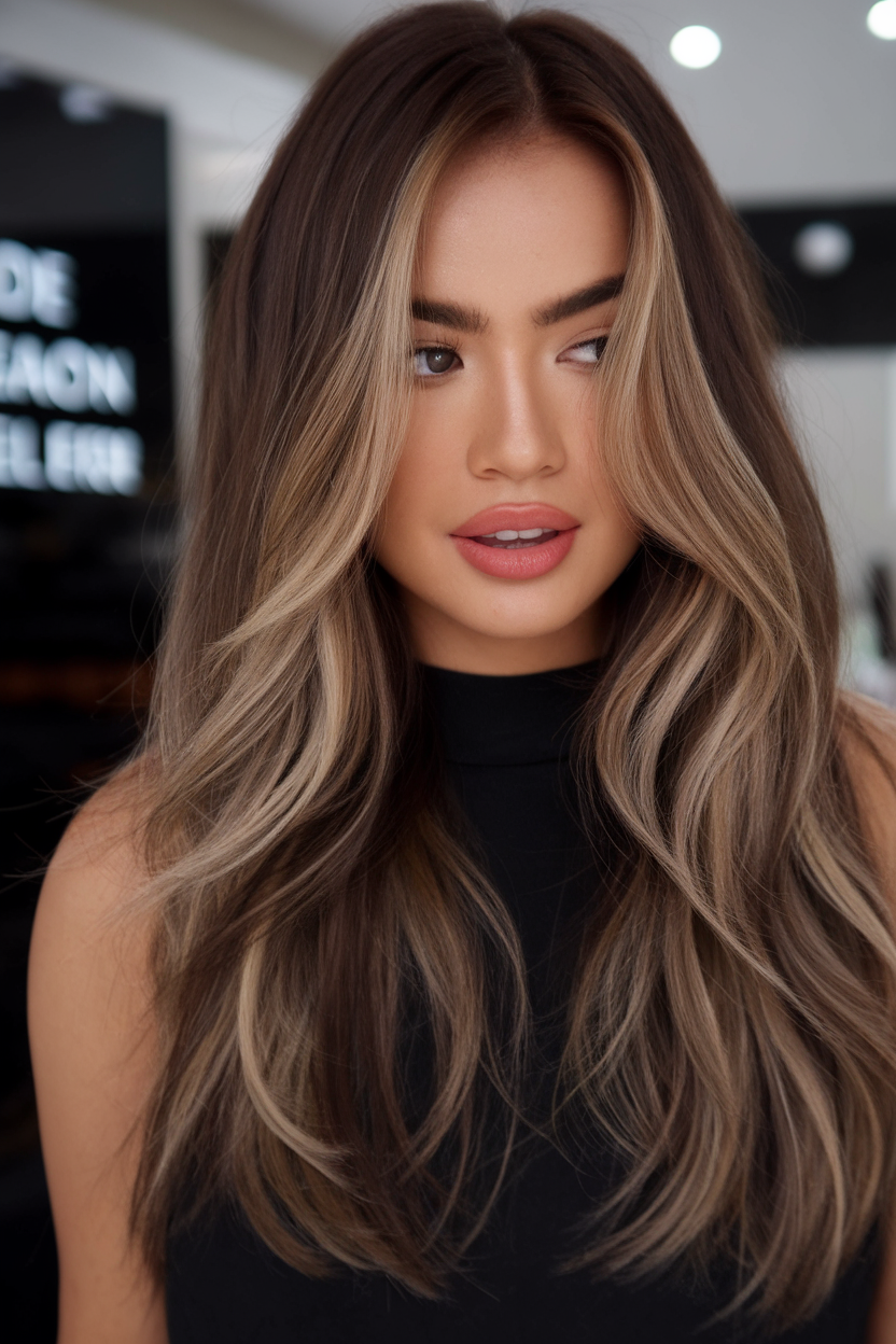 Long, voluminous layers are paired with ash blonde highlights, adding brightness and dimension to the brunette base. The wavy texture enhances the highlights, making this a perfect choice for spring hair color trends 2025. It’s a sophisticated style that blends elegance with a touch of modernity.