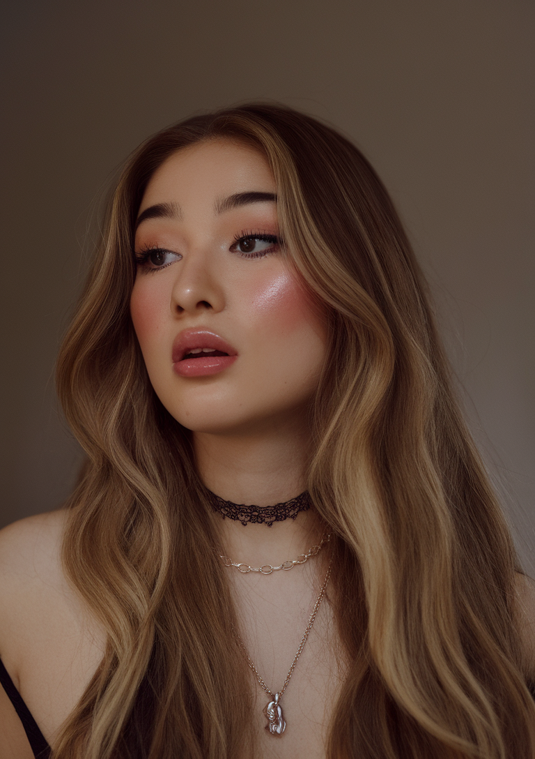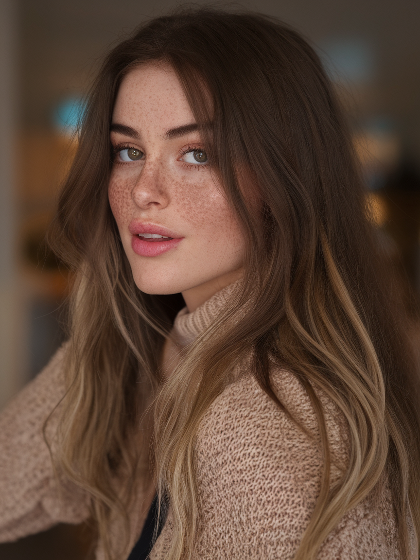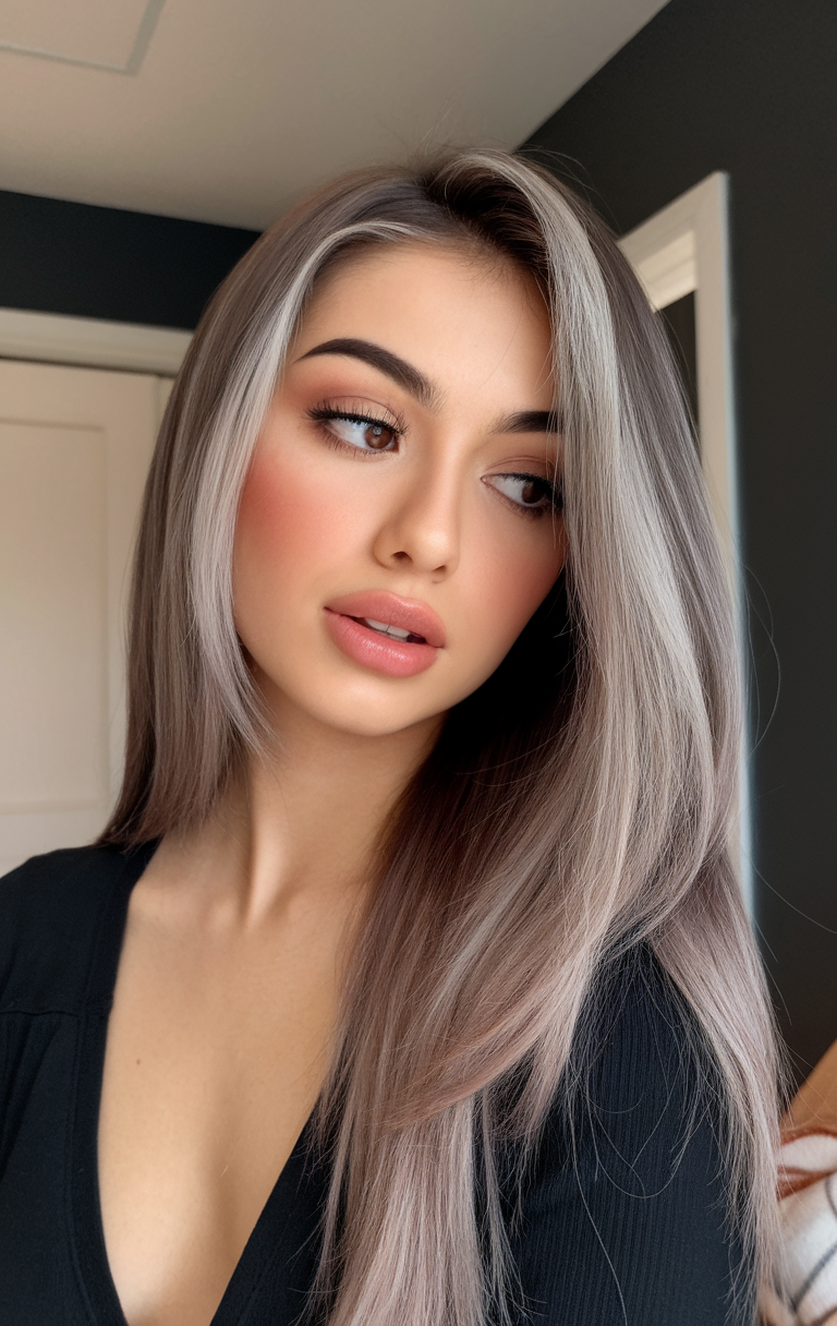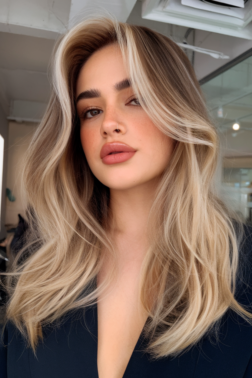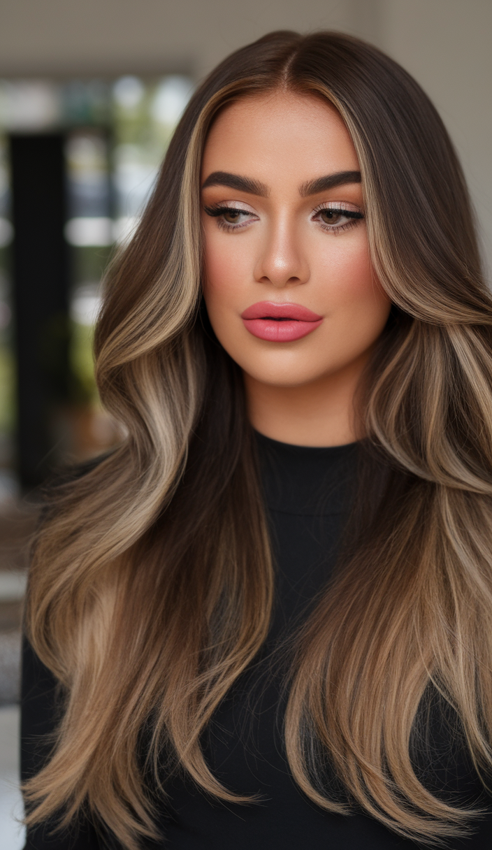 Long, voluminous layers are paired with ash blonde highlights, adding brightness and dimension to the brunette base. The wavy texture enhances the highlights, making this a perfect choice for spring hair color trends 2025. It’s a sophisticated style that blends elegance with a touch of modernity.