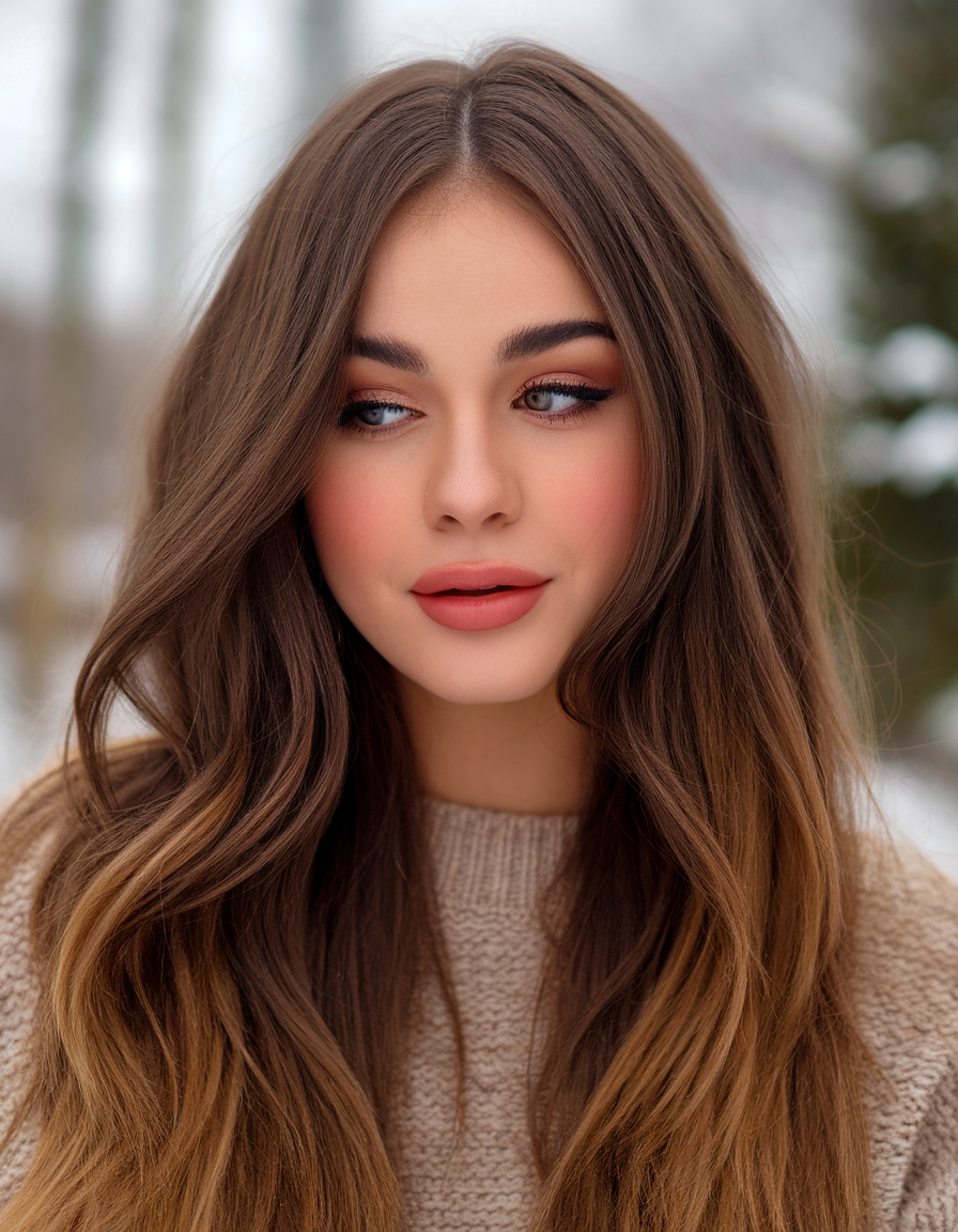 A rich, dark brown base is enhanced by natural-looking caramel highlights that start at the mid-lengths and blend seamlessly into the ends. The long, flowing hair is styled in soft layers, giving it volume and texture. This understated look exudes effortless sophistication.