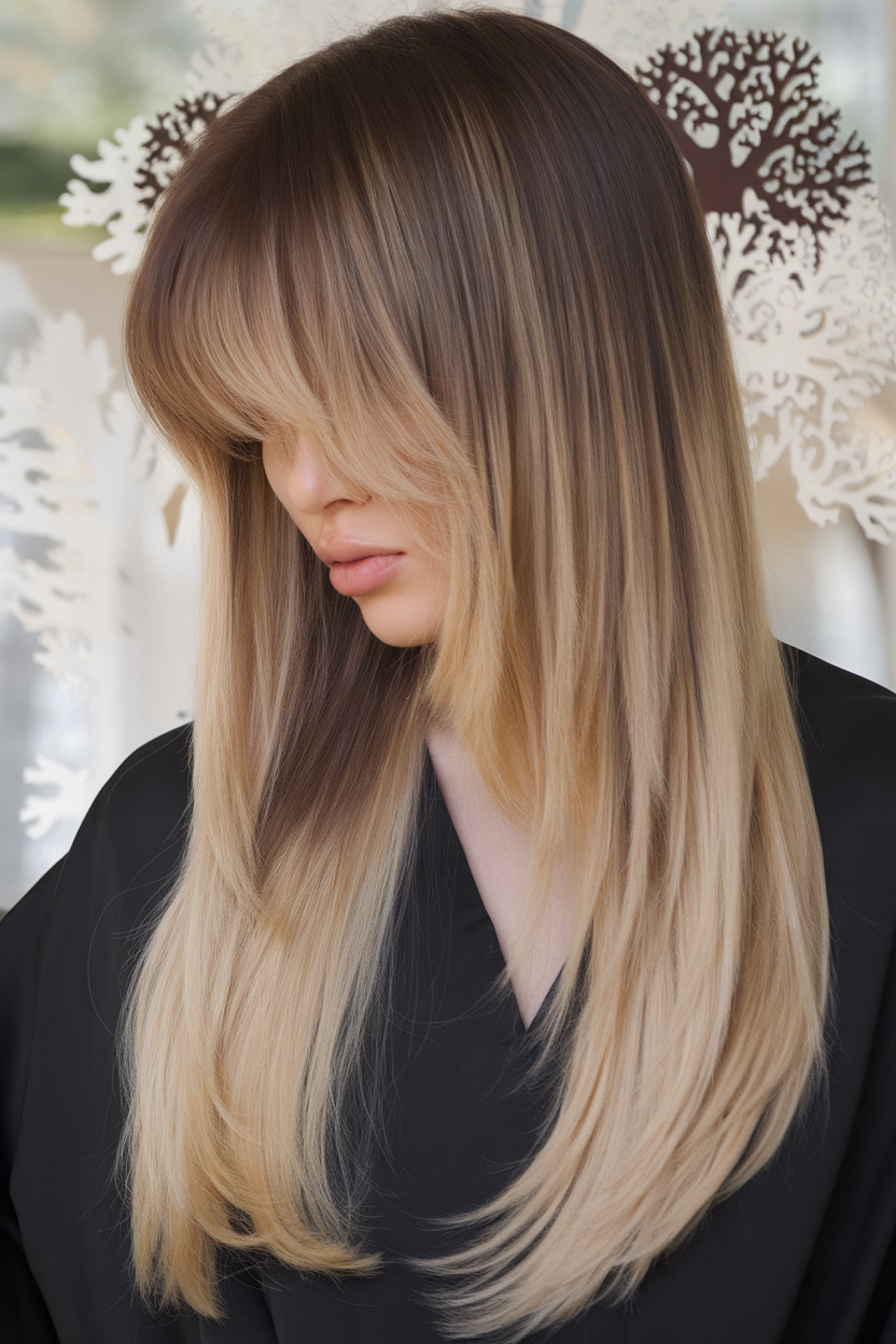 This look features a smooth transition from dark brown roots to a light blonde ombre, complemented by soft curtain bangs. The sleek, straight hair adds a polished and modern vibe, perfect for spring hair trends. It’s ideal for those wanting a chic yet low-maintenance hair color idea.