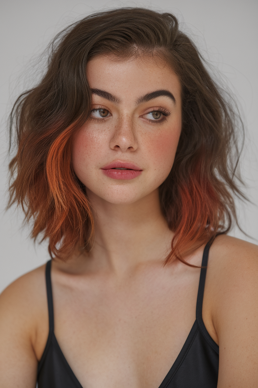 A textured bob is enhanced with bold copper streaks, adding a fun and vibrant twist to the dark base. The wavy texture amplifies the contrast, making this style perfect for spring hair color trends 2025. It’s a standout look for those who love experimenting with trendy hair colors.