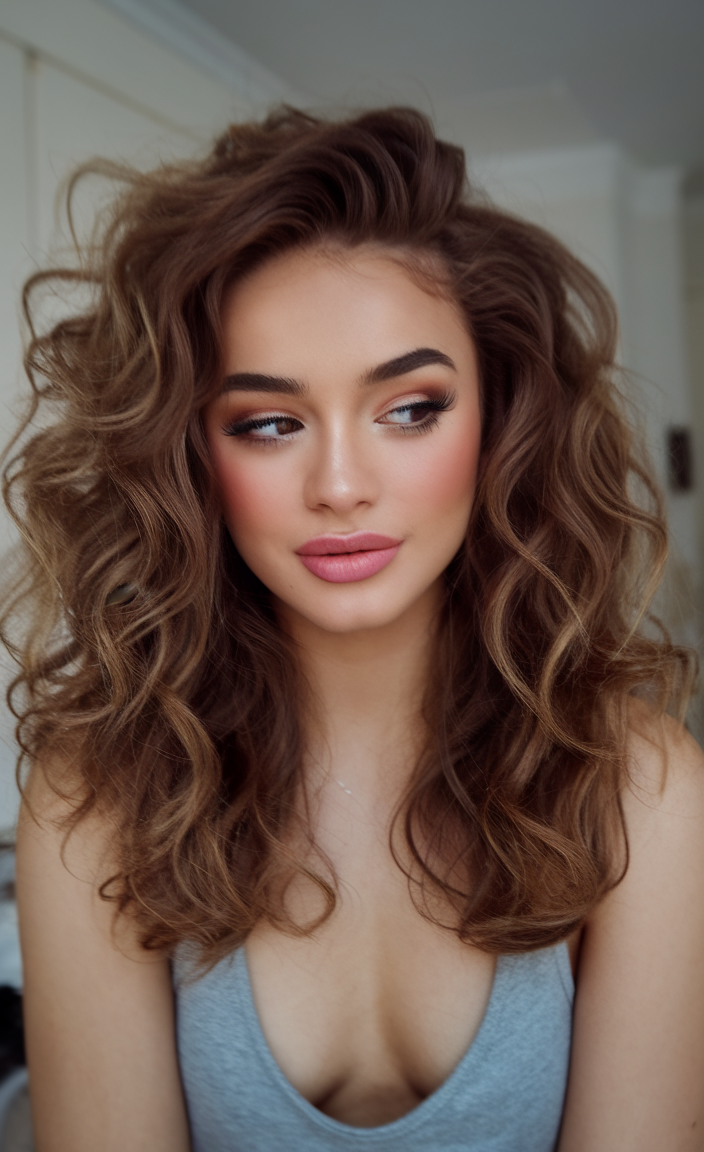 This hairstyle features thick, voluminous curls with defined layers, adding texture and body to the hair. The rich brown color enhances the natural curl pattern, making it perfect for spring hair color trends. It’s a bold, elegant choice for those seeking effortless glamour.