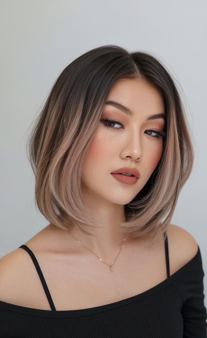 A sleek ash blonde bob is elevated by dark roots for a striking contrast that’s both trendy and modern. The soft layers frame the face beautifully, adding dimension to this classic short haircut. This style is a sophisticated choice for spring hair color ideas.