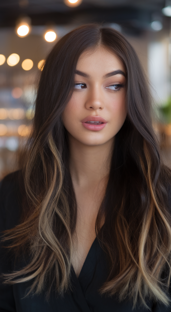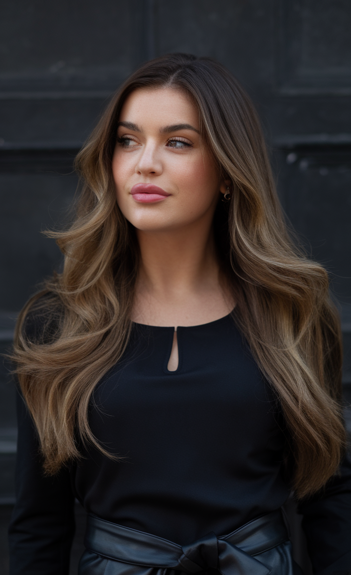 This hairstyle showcases long, glossy brunette waves with soft, lightened ends for a natural sun-kissed effect. The subtle gradient adds dimension and warmth, making it ideal for spring hair color ideas. It’s a versatile look that blends elegance with a casual touch.
