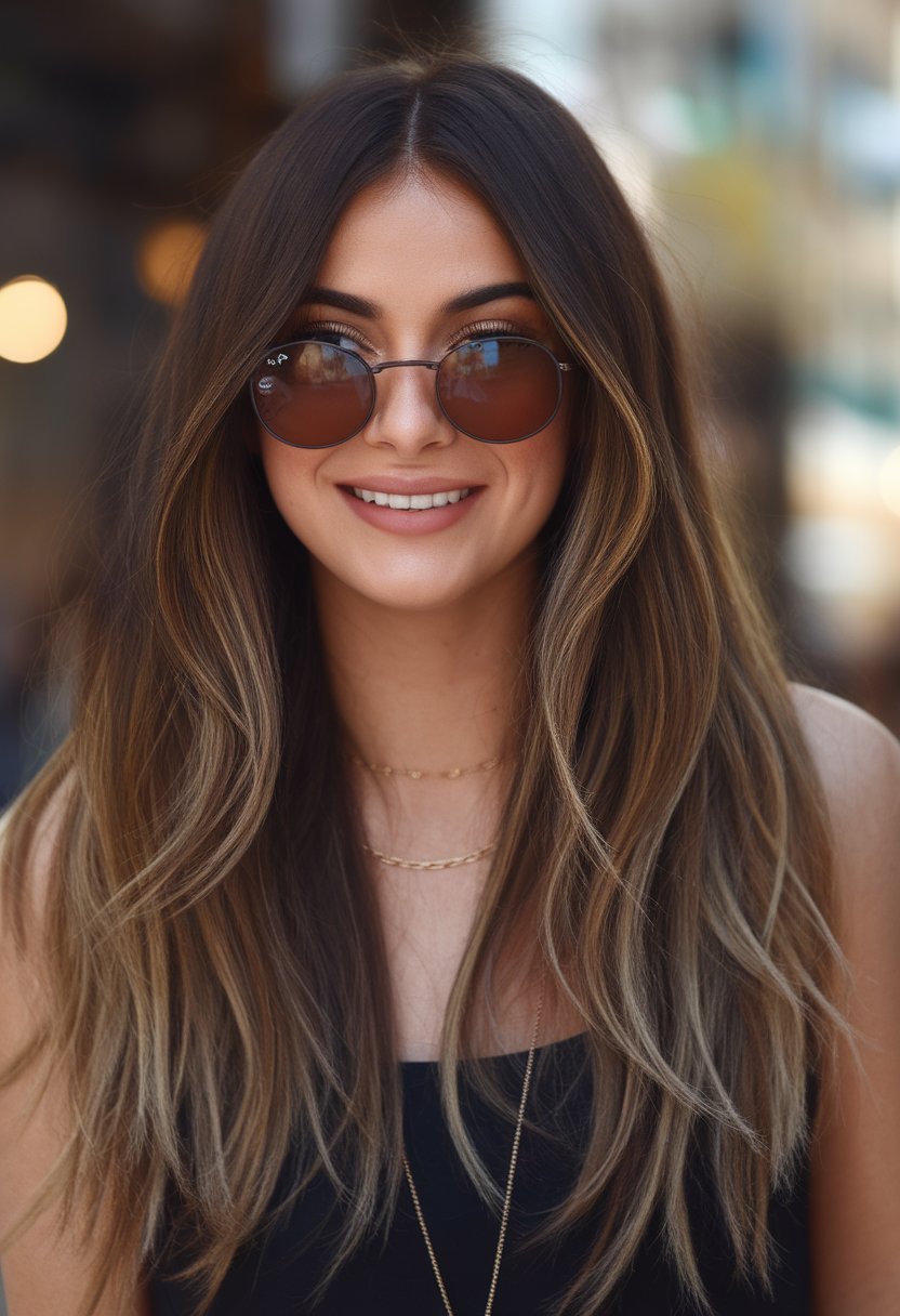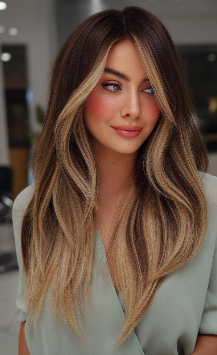 This style features caramel balayage with blonde strands framing the face, giving a soft and glowing look. The natural brunette base blends seamlessly with the highlights, creating a natural-looking and dimensional finish. Perfect for spring hair, this look complements straight hair beautifully.