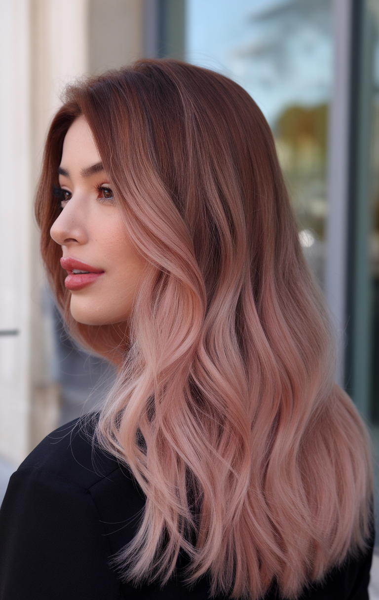 The hair features soft, loose waves in a stunning rose gold hue, blending a light pink with hints of warm copper. The mid-length cut frames the face elegantly, with a smooth, glossy finish adding a polished touch. This style is perfect for those who love a romantic and modern vibe.