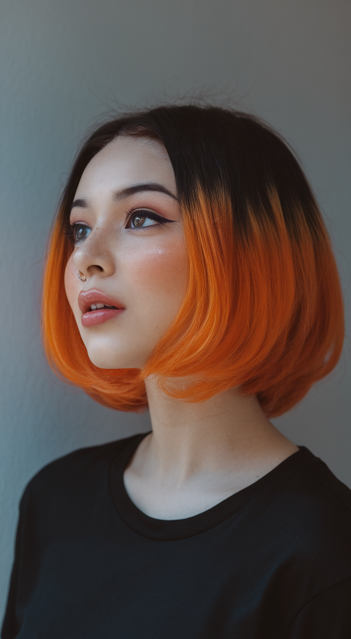 This sleek bob is a daring ombre of deep black roots that transition sharply into a vivid orange. The blunt cut enhances the boldness of the colors, while the soft curve at the ends adds a playful dimension. Ideal for those looking to make a bold statement with their hair.