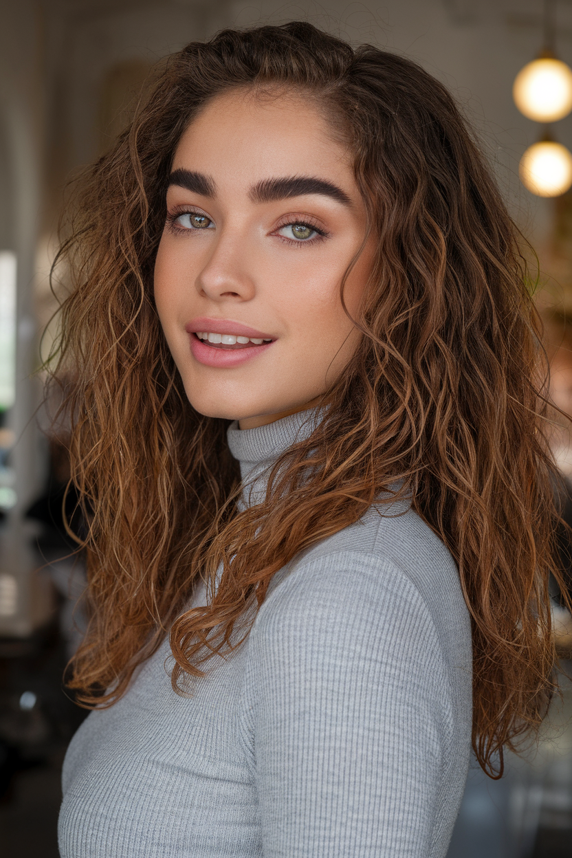 This style showcases natural curly hair enhanced with warm brown highlights that add depth and vibrancy. The highlights are placed to define the texture and give the curls a soft, luminous finish. It’s a perfect look for spring hair trends, combining a natural-looking and low-maintenance approach.