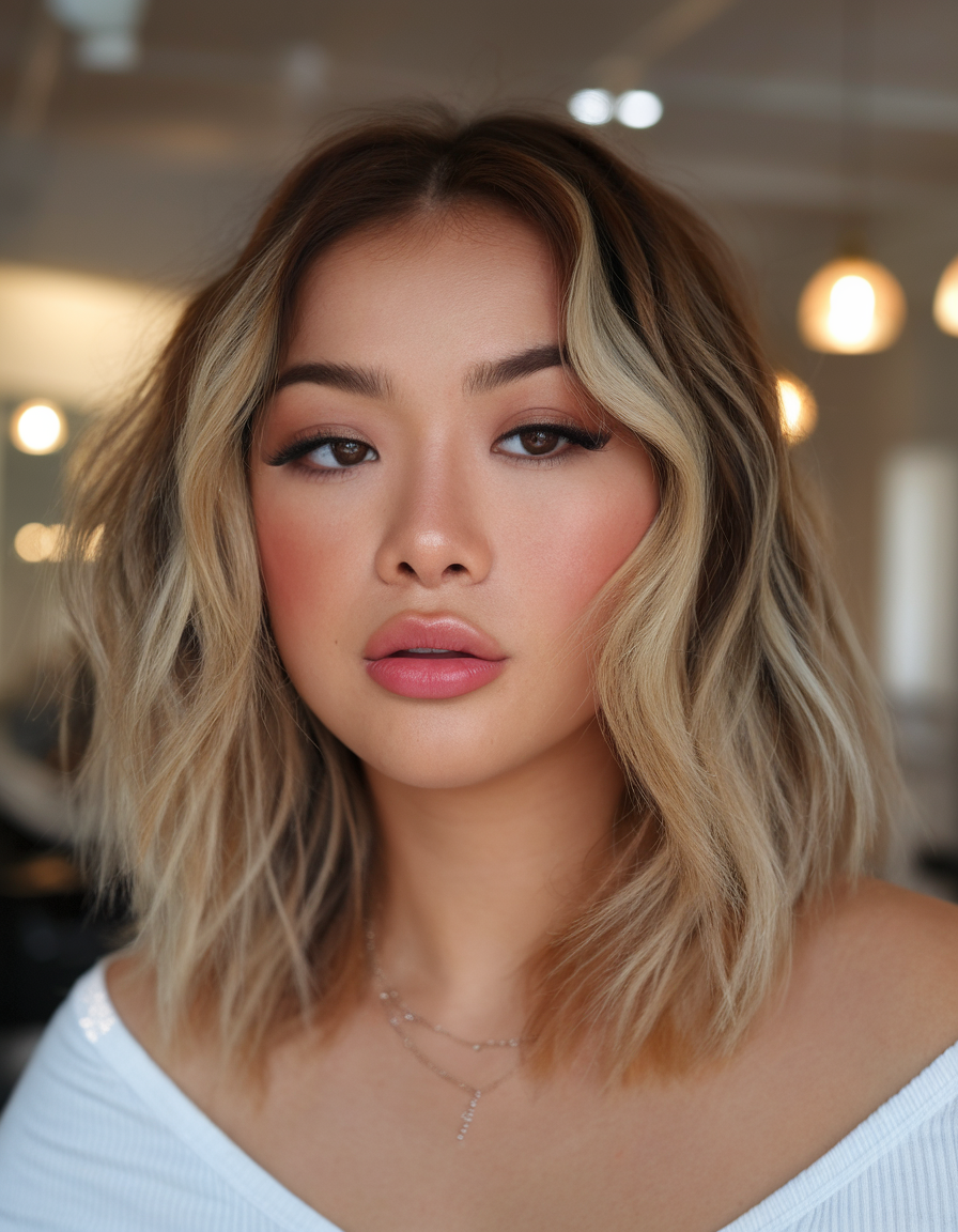 A textured short bob is elevated with a blonde balayage, creating a bold and trendy contrast against the darker roots. The waves bring out the dimension of the highlights, making this style a perfect pick for spring hair color ideas. It’s ideal for those who want a modern and playful short haircut.