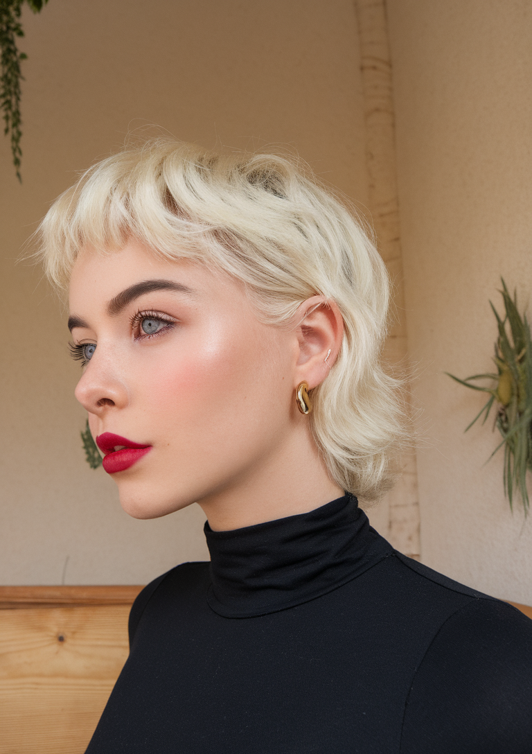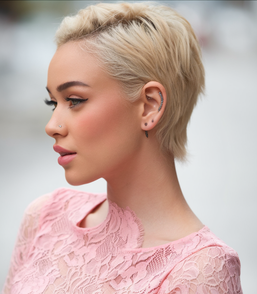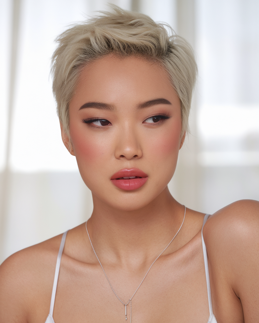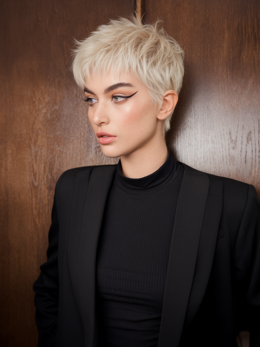 This trendy ultra short pixie cut is all about sharp texture and movement. The icy blonde shade adds a bold, modern edge, making it perfect for those who love grunge and 90s-inspired styles. The choppy layers create dimension, enhancing the edgy yet sophisticated appeal. A great choice for women looking for a stylish yet effortless spring pixie haircut 2025.