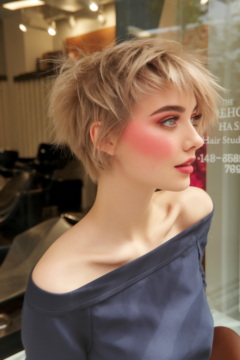 This trendy spring pixie haircut 2025 is all about effortless movement with its feathered layers. The sandy blonde shade enhances the natural messy texture, making it perfect for a carefree yet stylish look. The slightly tousled fringe adds a modern touch, complementing the airy, voluminous shape. A fresh and feminino option for those who love a soft, natural finish.