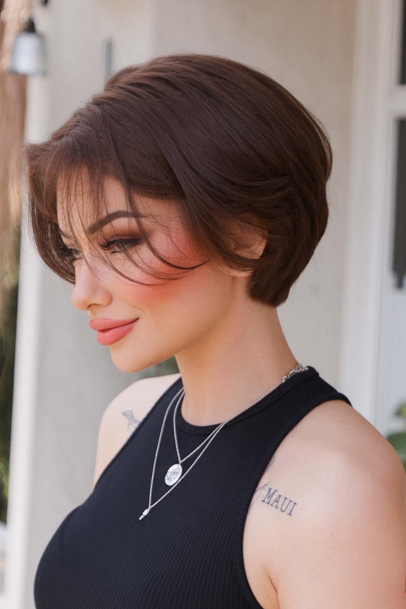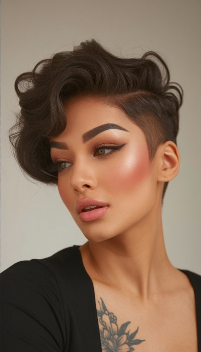 This modern short pixie brings drama with its bold undercut and sculpted wavy layers. The deep brunette color enhances the glossy texture, adding depth and volume to the look. The contrast between the shaved sides and the voluminous top makes it a perfect choice for those who love grunge-inspired trendy styles. A powerful, statement haircut that embodies confidence.